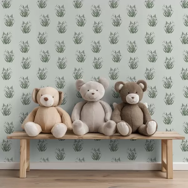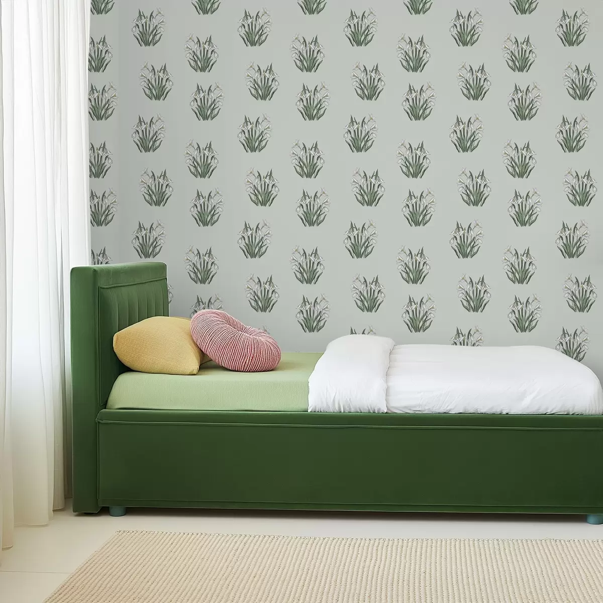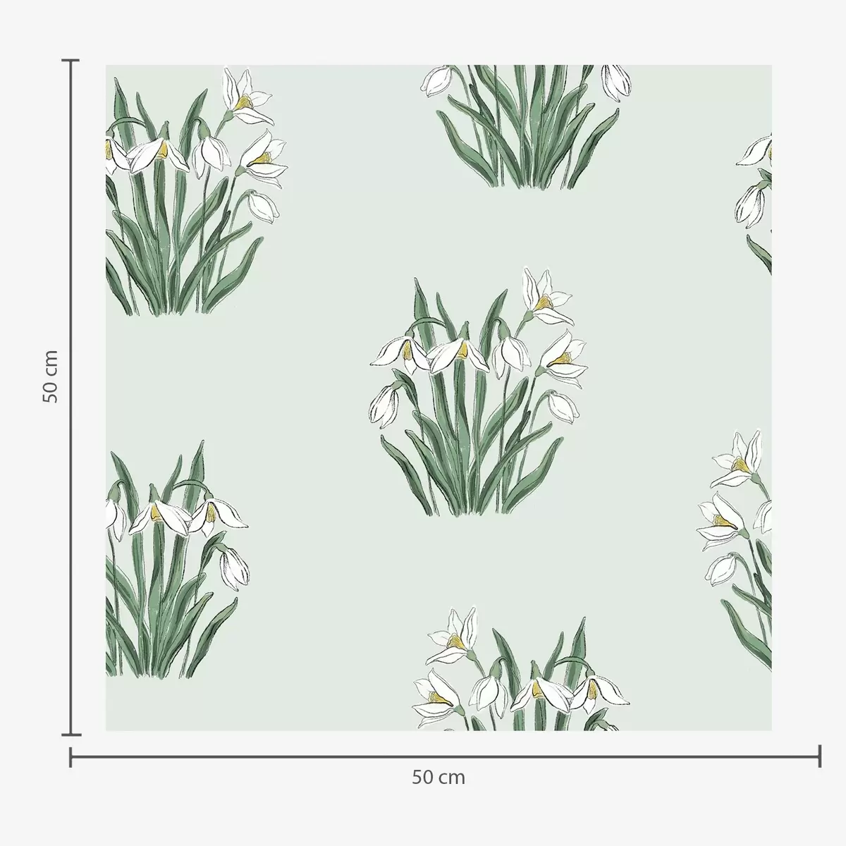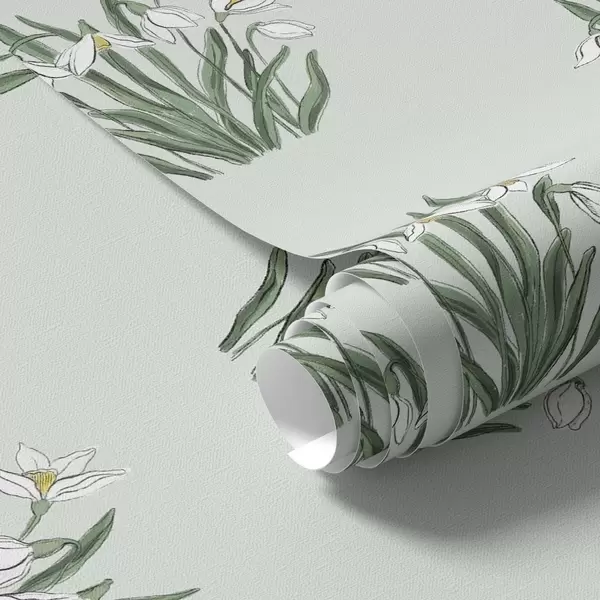 Papel de parede Snowdrops com folhas verdes sobre um fundo verde pastel Nr. a00651