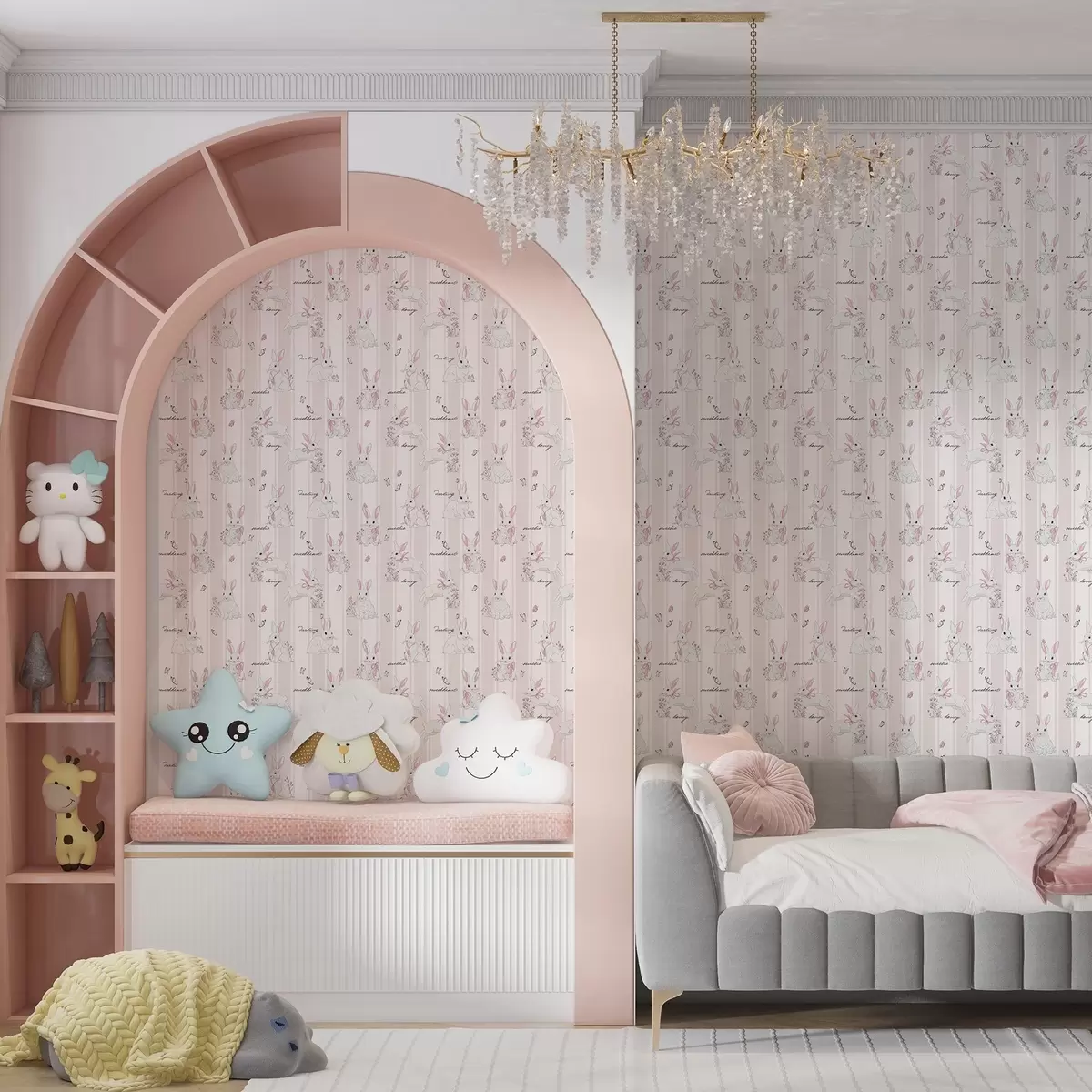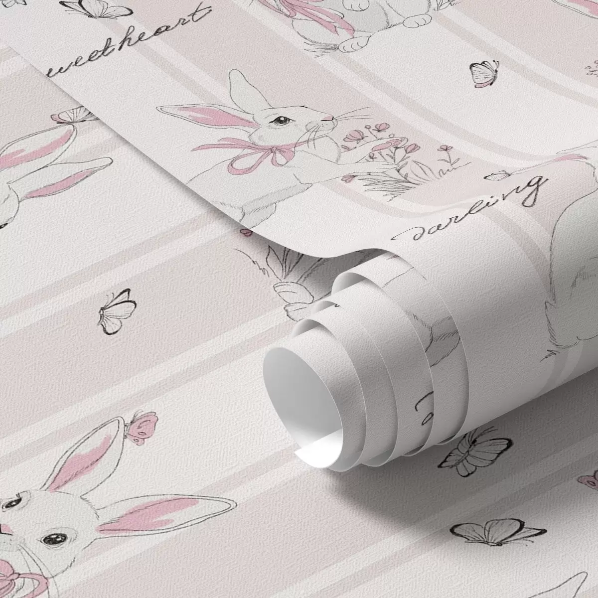 Papel de parede Coelhinhos com laços, listras rosa e pequenas letras Nr. a00657