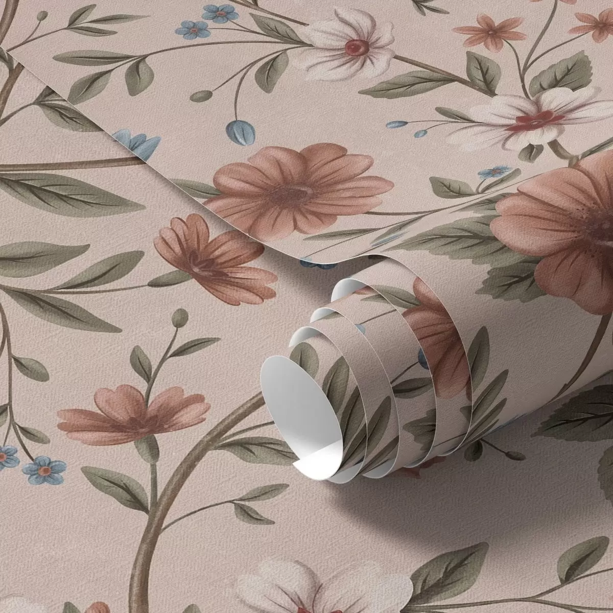 Papel de parede Flores e folhagem rosa-coral sobre fundo rosa empoeirado a00667