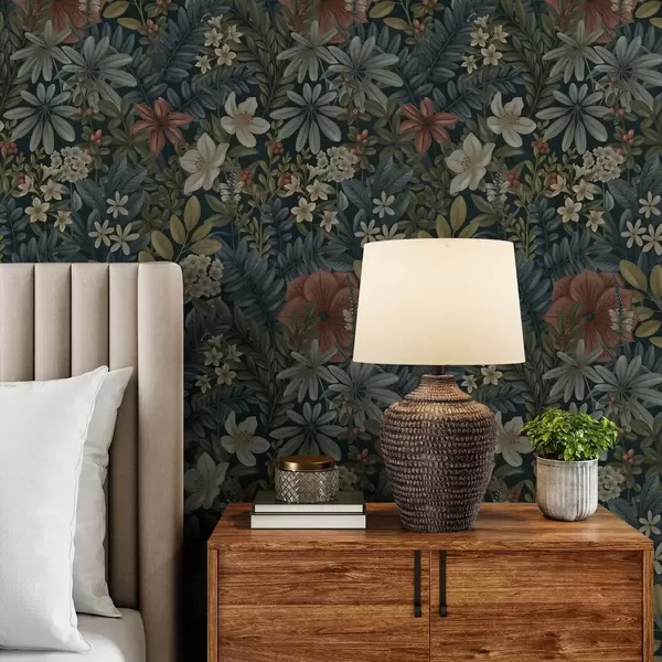 Papel de parede Fundo escuro com flores e folhas densas em tons quentes Nr. a00678