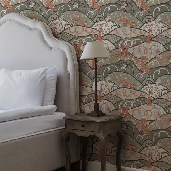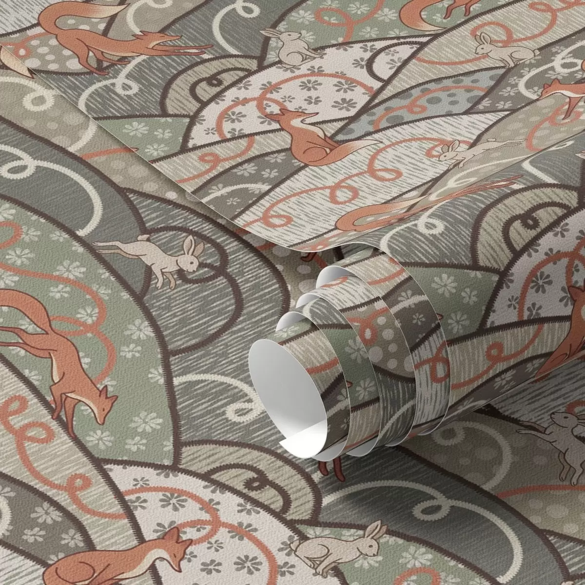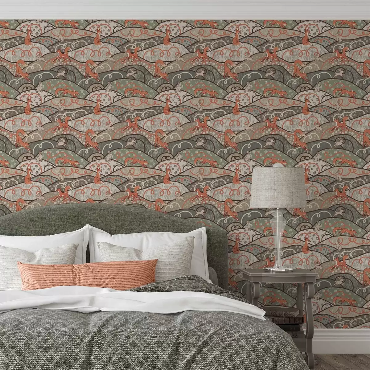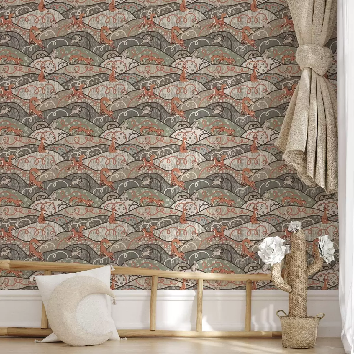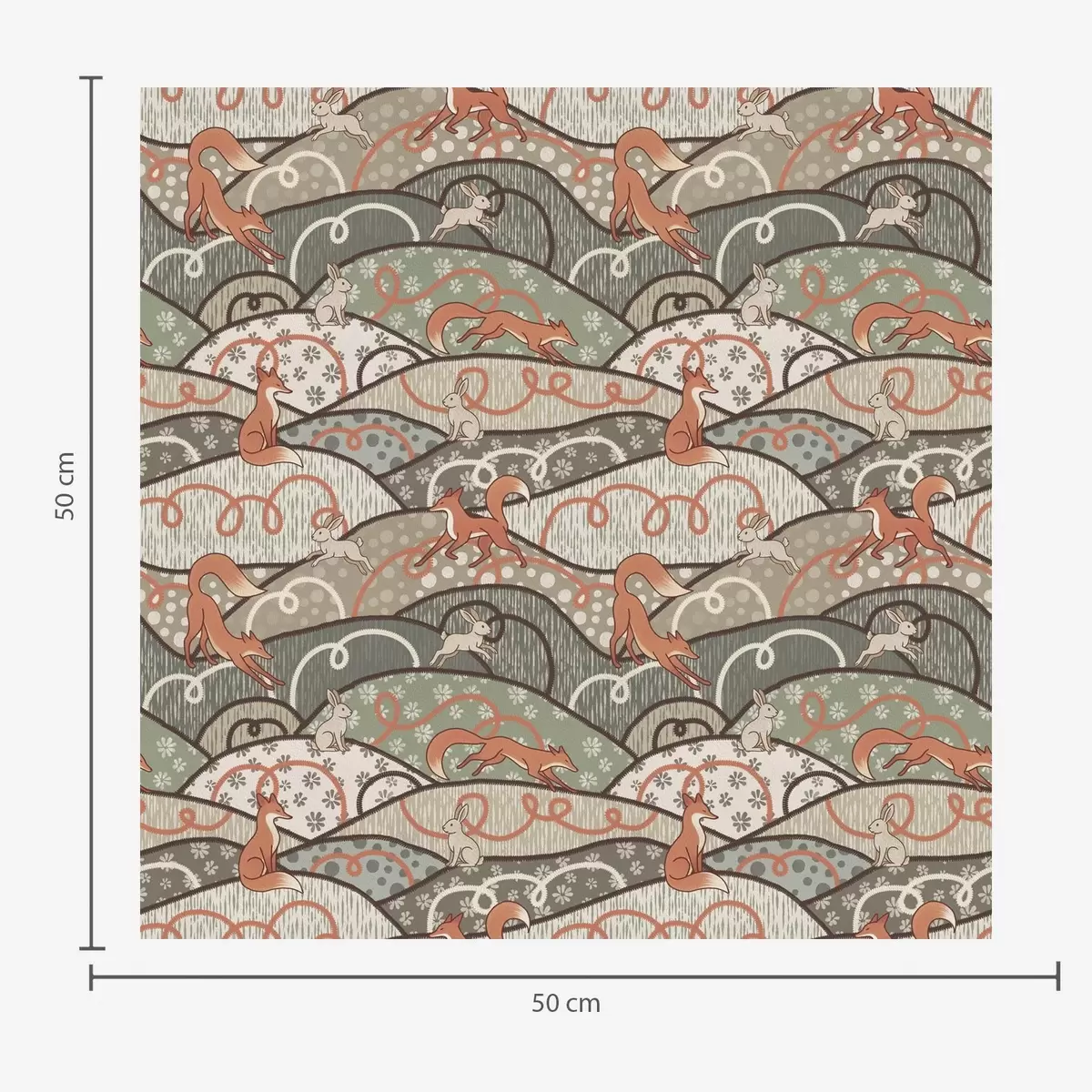 Papel de parede Raposas e lebres em colinas onduladas, padrão retrô Nr. a00690