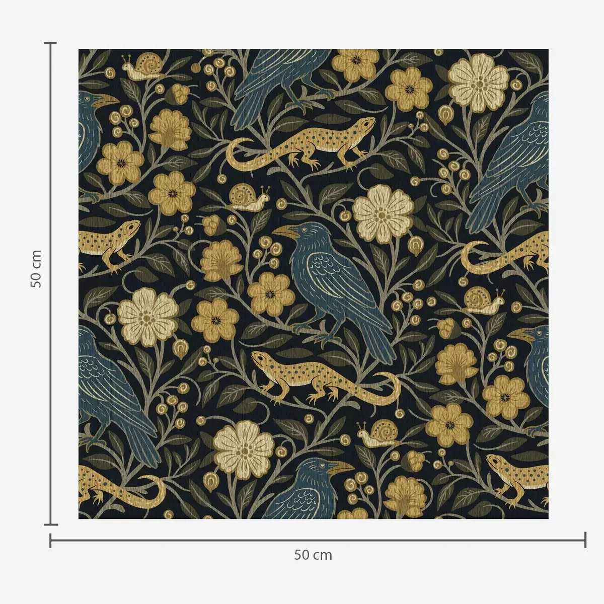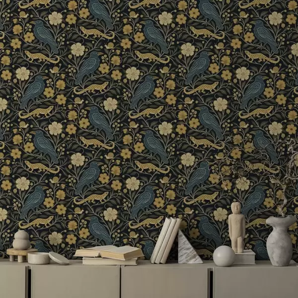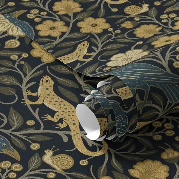 Papel de parede Pássaros, lagartos e caracóis entre flores em um fundo escuro Nr. a00691