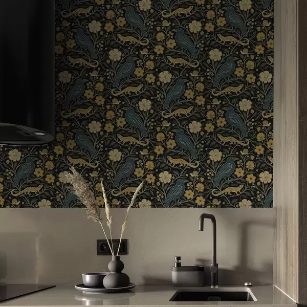 Papel de parede Pássaros, lagartos e caracóis entre flores em um fundo escuro Nr. a00691