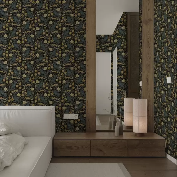 Papel de parede Pássaros, lagartos e caracóis entre flores em um fundo escuro a00691