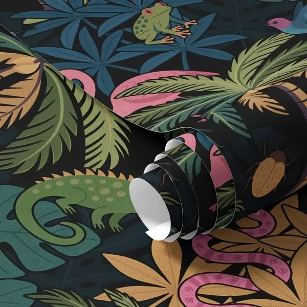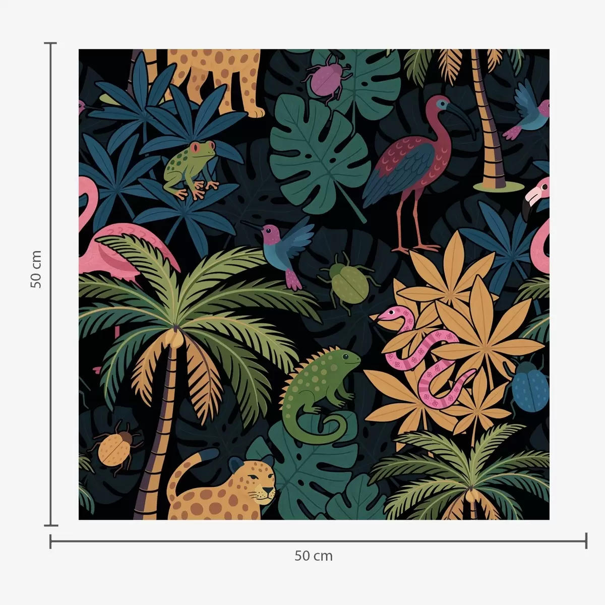 Papel de parede Animais tropicais brilhantes entre folhagens em um fundo escuro Nr. a00701