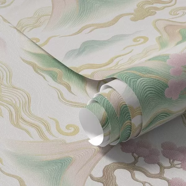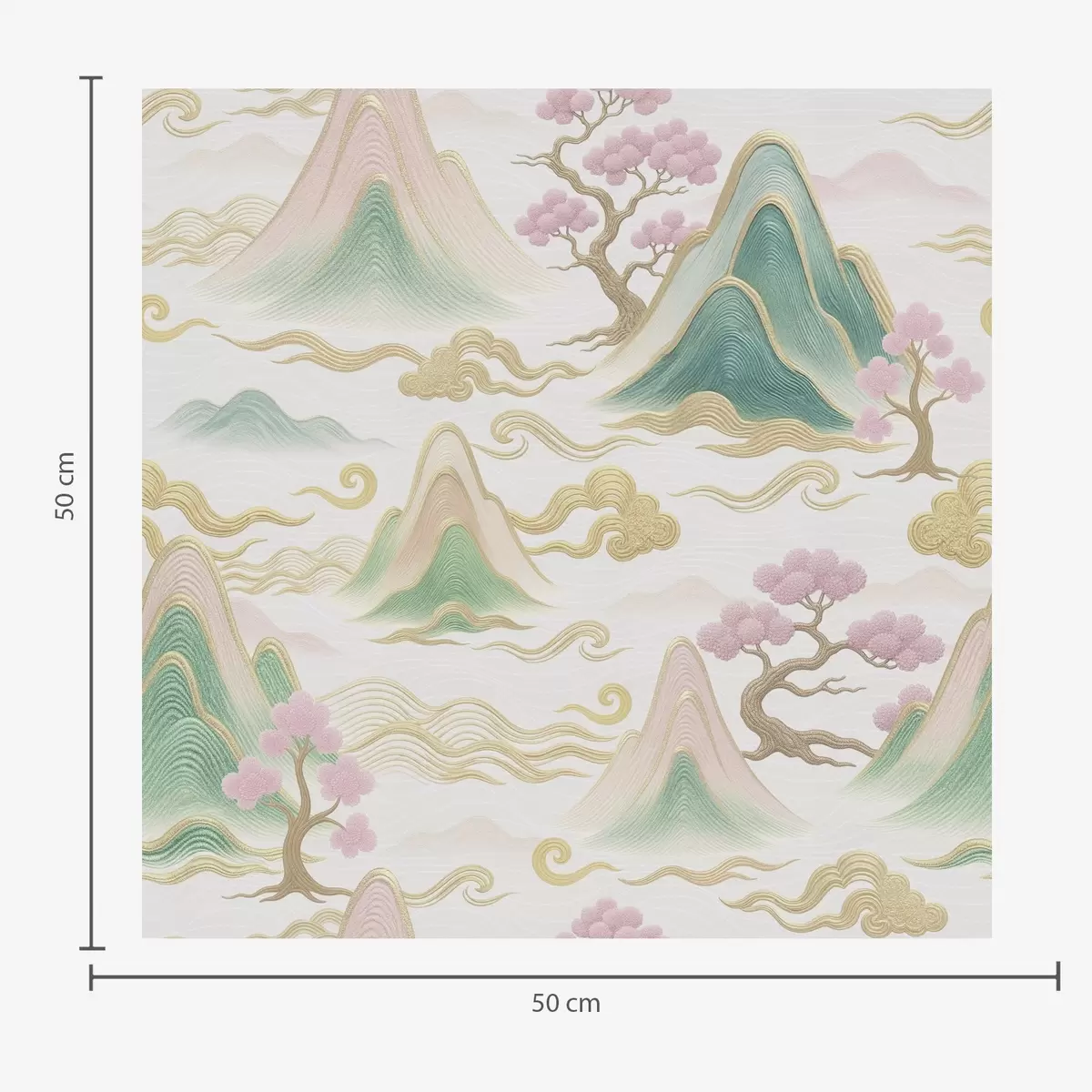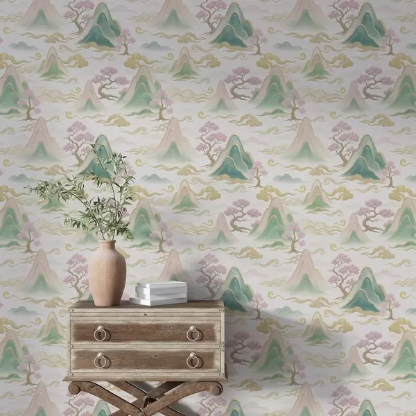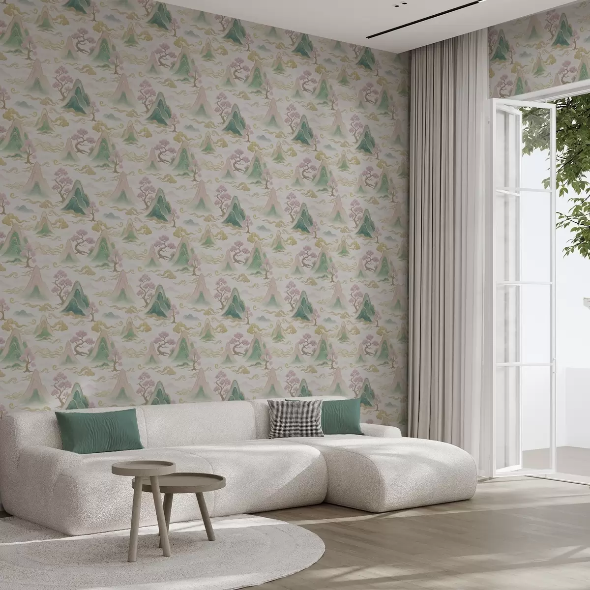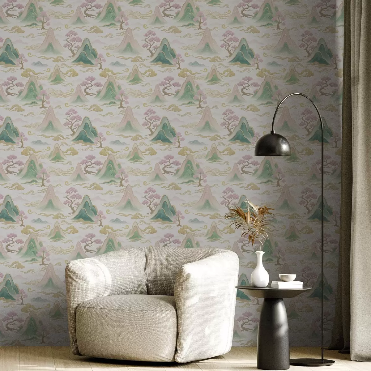 Papel de parede Montanhas, nuvens e pinheiros em estilo decorativo oriental Nr. a00703