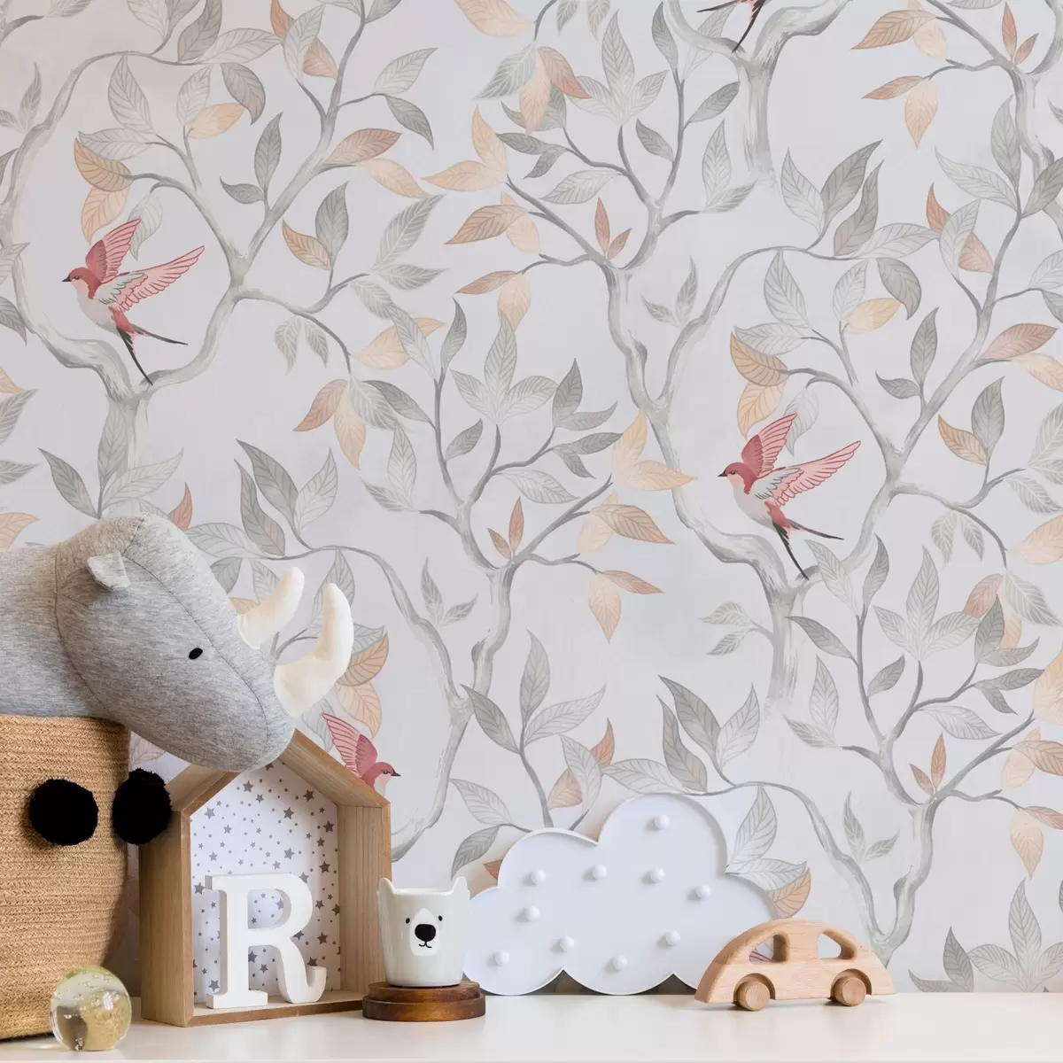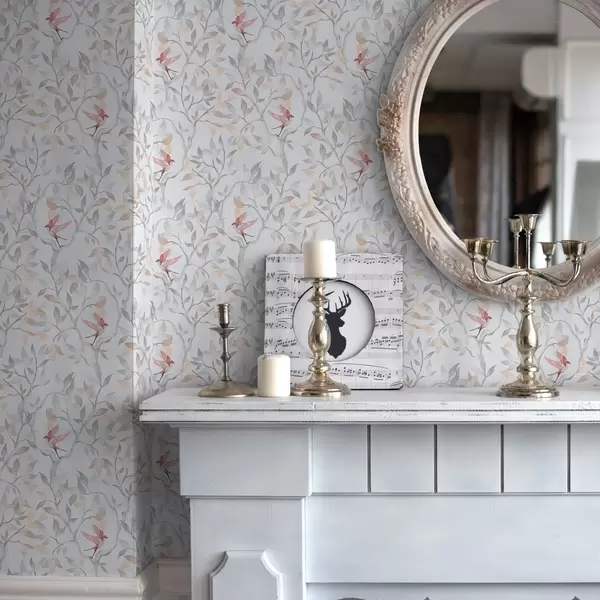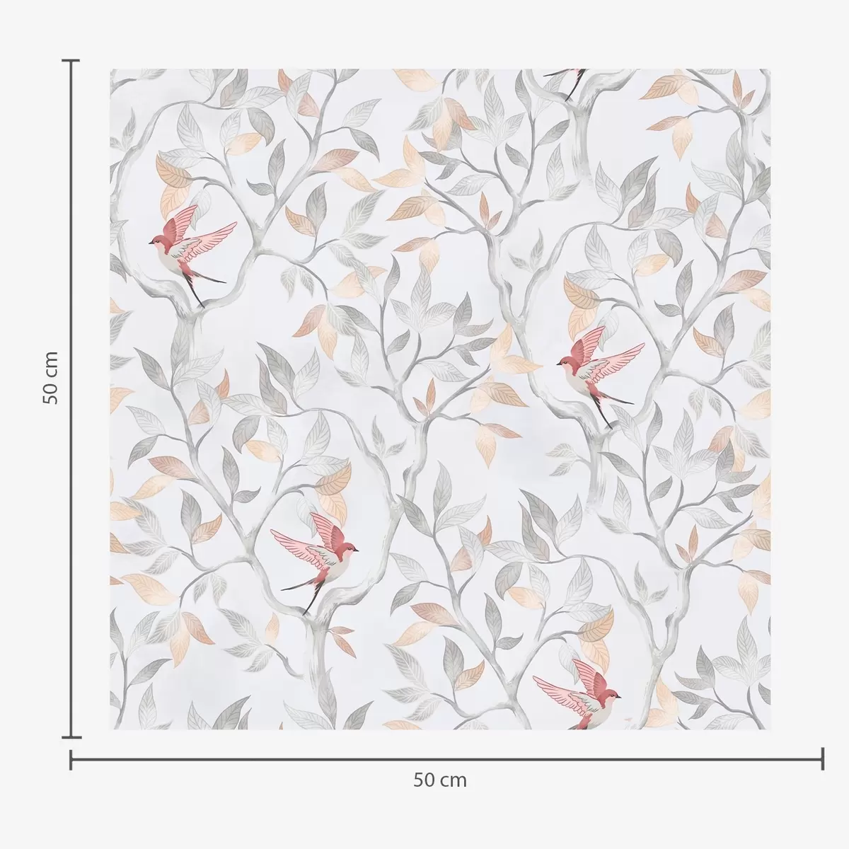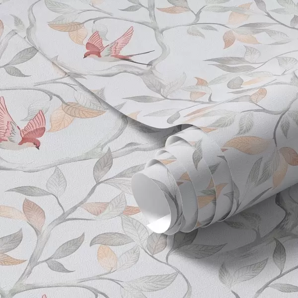 Papel de parede Galhos leves com folhas e pássaros em tons de pêssego Nr. a00716