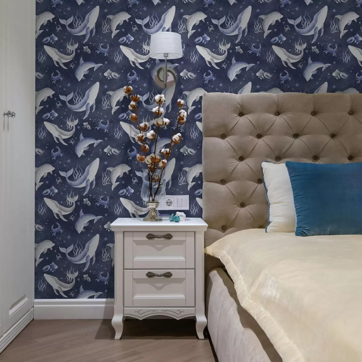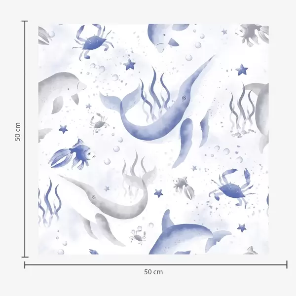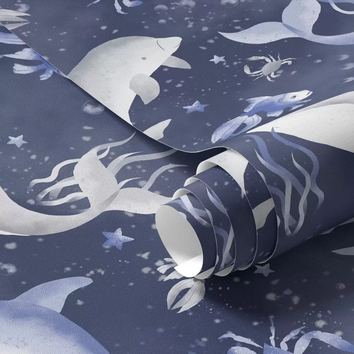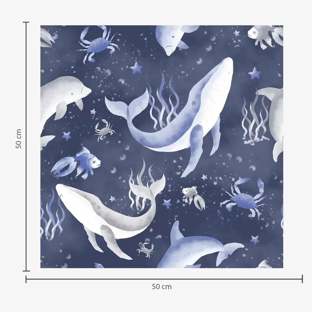 Papel de parede Baleias marinhas, golfinhos e caranguejos sobre um fundo azul escuro Nr. a00720