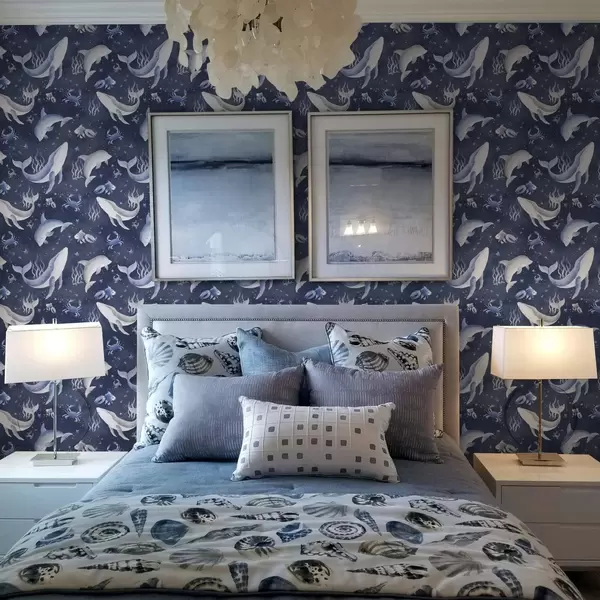 Papel de parede Baleias marinhas, golfinhos e caranguejos sobre um fundo azul escuro Nr. a00720