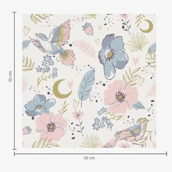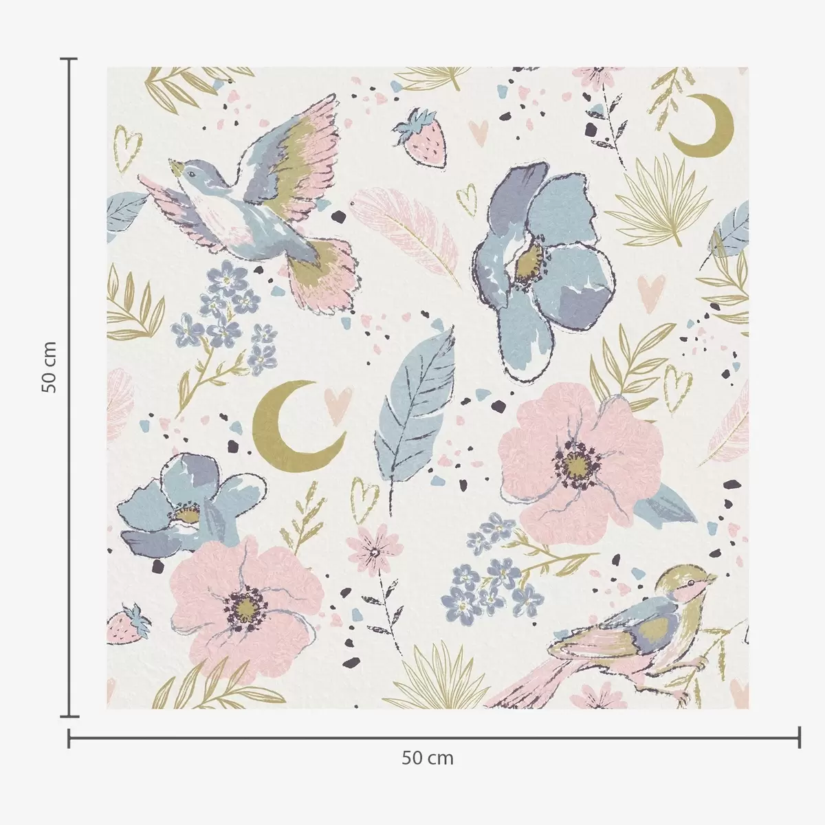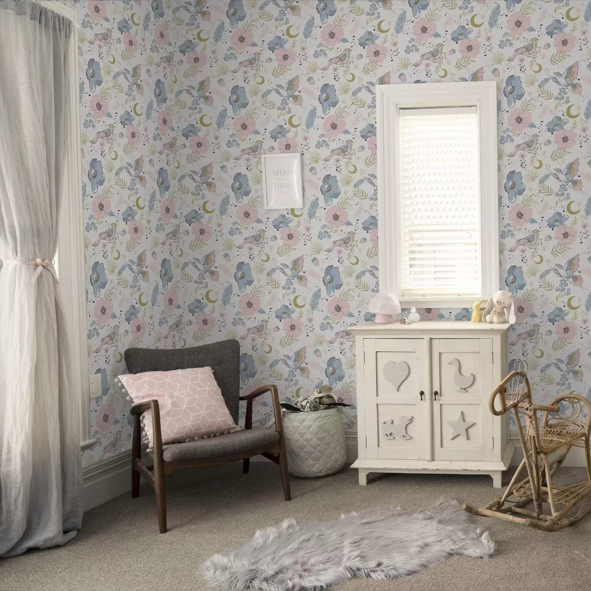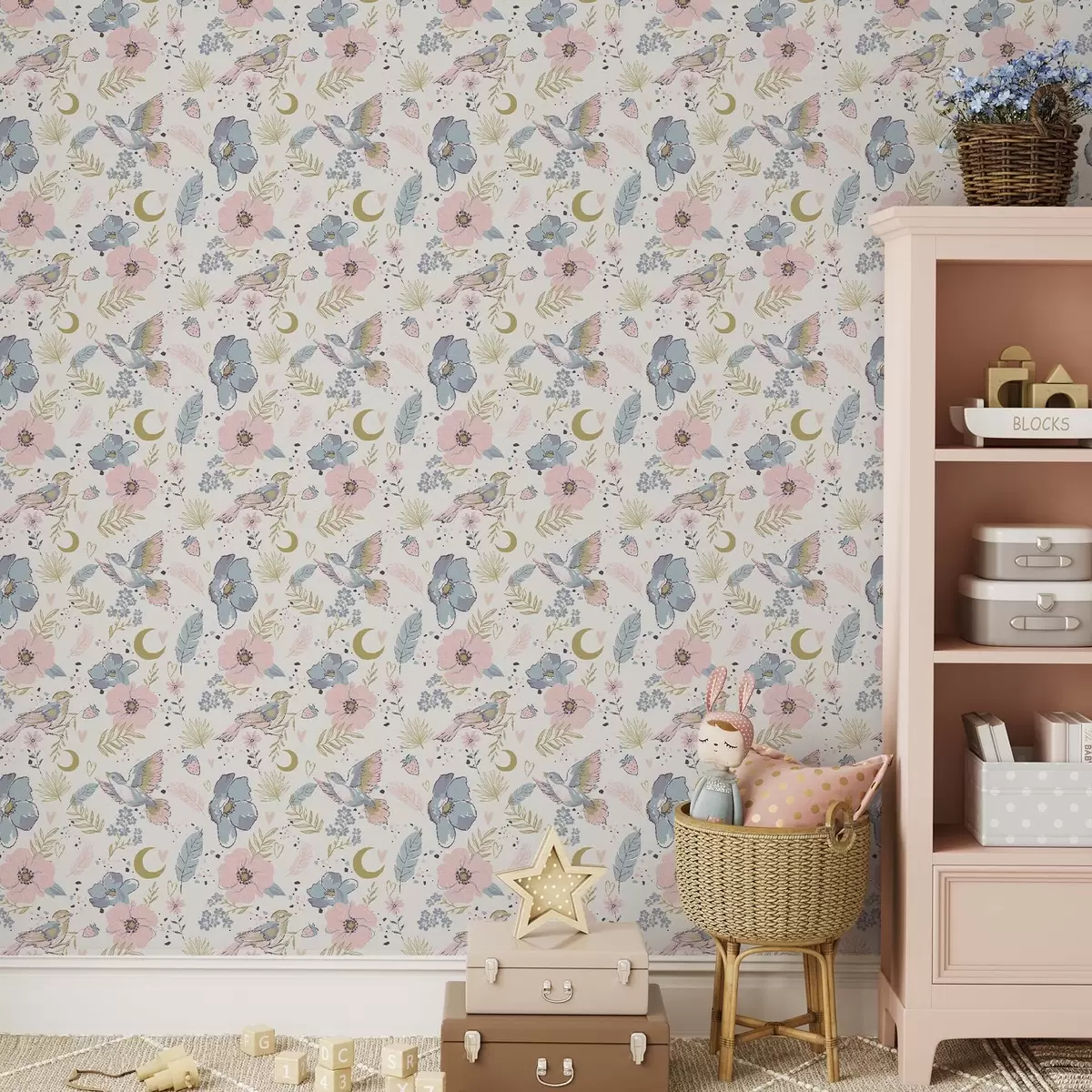Papel de parede Pássaros e flores em tons pastéis com luas crescentes sobre fundo branco Nr. a00721