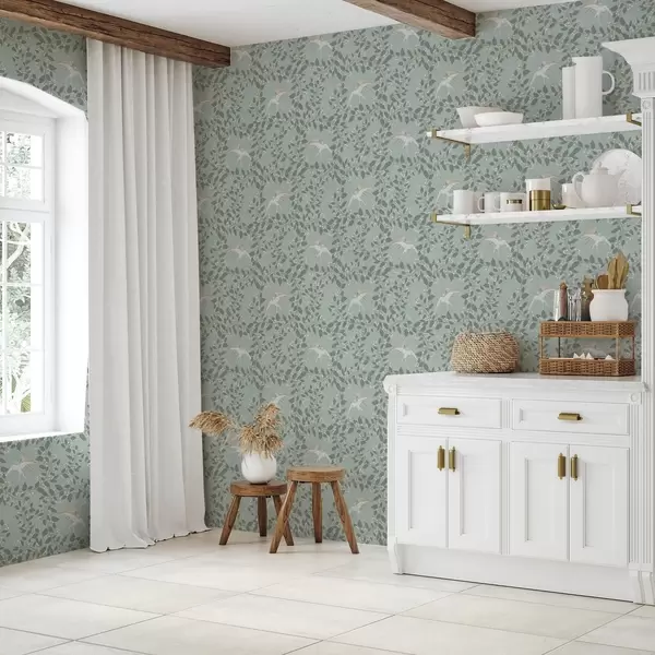 Papel de parede Galhos com bagas brancas e pássaros sobre um fundo verde Nr. a00731