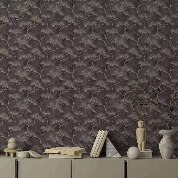 Papel de parede Silhuetas de pinheiros em um fundo escuro, textura enevoada a00742