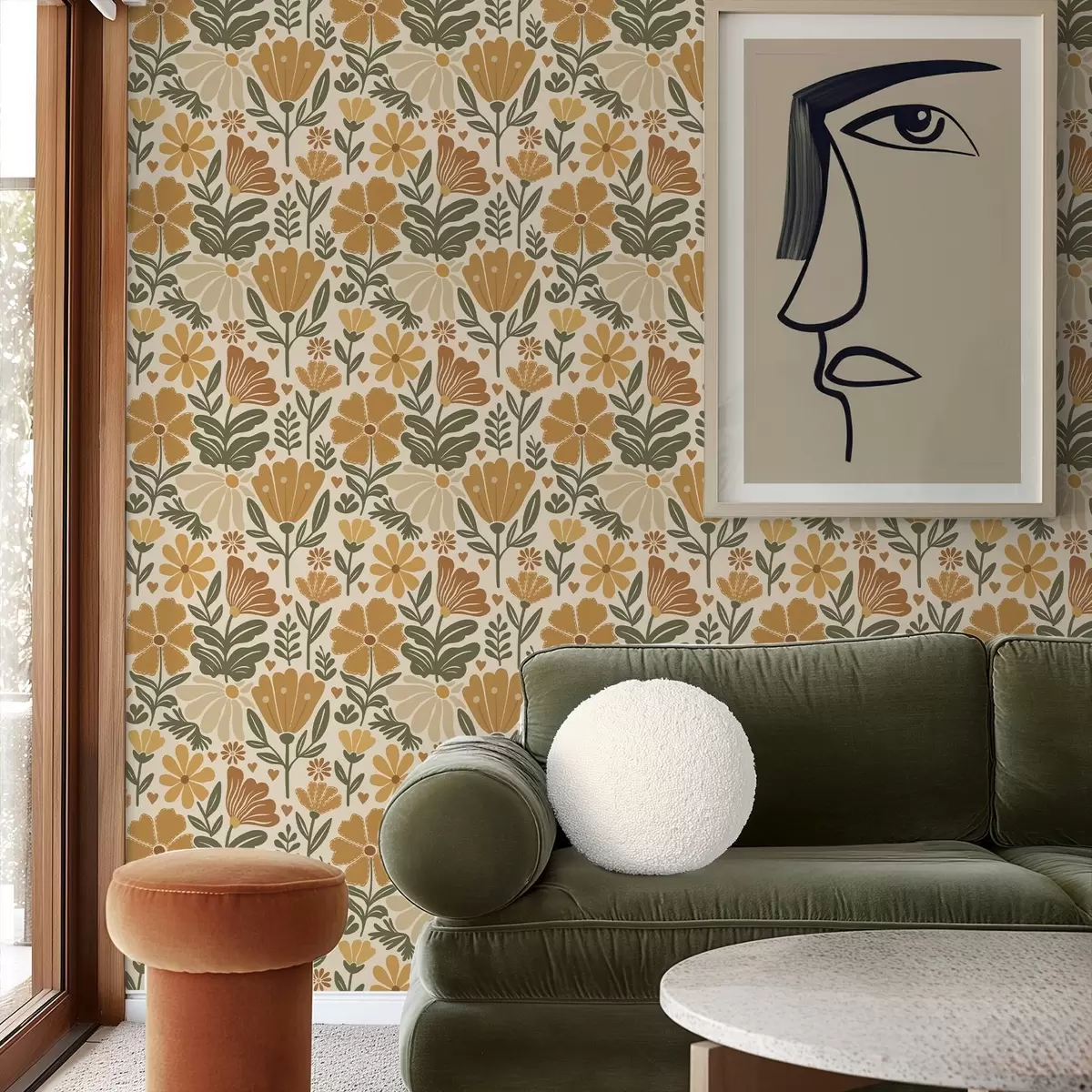 Papel de parede Flores estilizadas em tons quentes com corações a00752