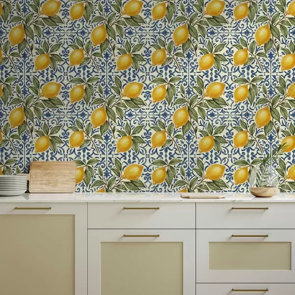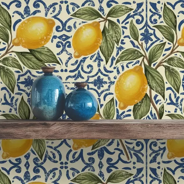 Papel de parede Galhos de limão com fundo ornamental azul Nr. a00763