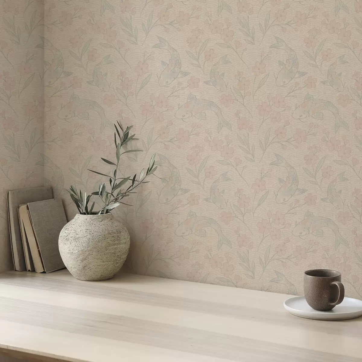 Papel de parede Carpas entre flores em suaves tons de bege-rosa Nr. a00766