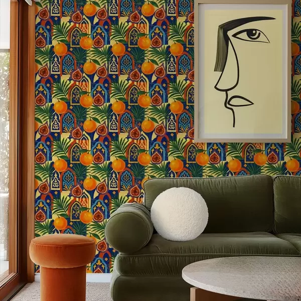 Papel de parede Laranjas brilhantes, folhas de palmeira e arcos marroquinos Nr. a00767