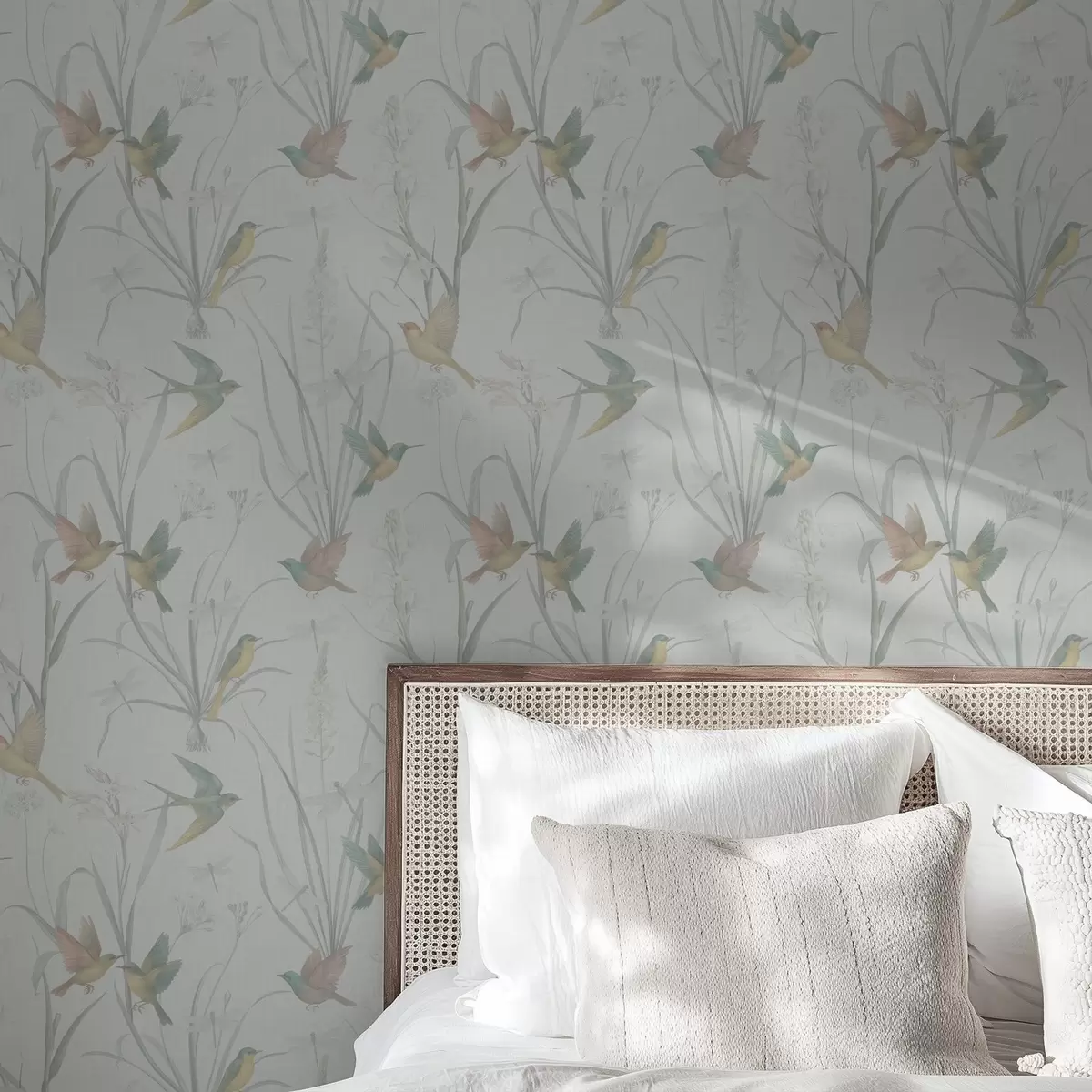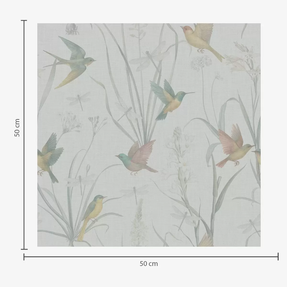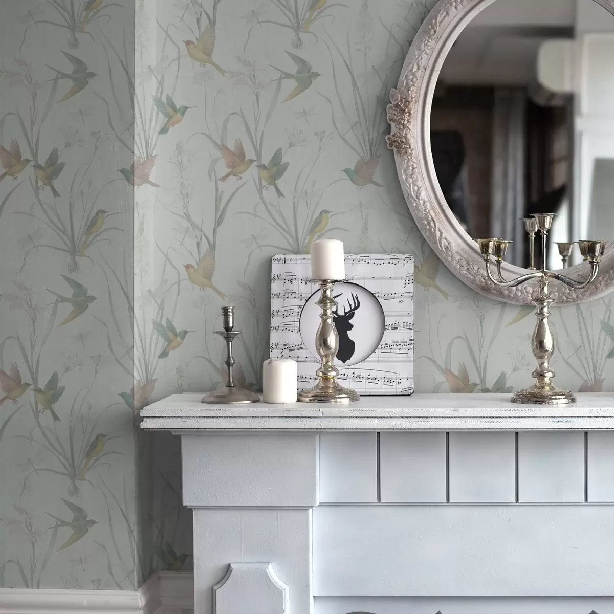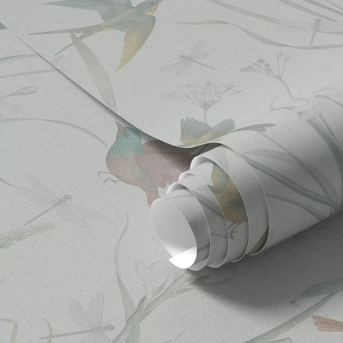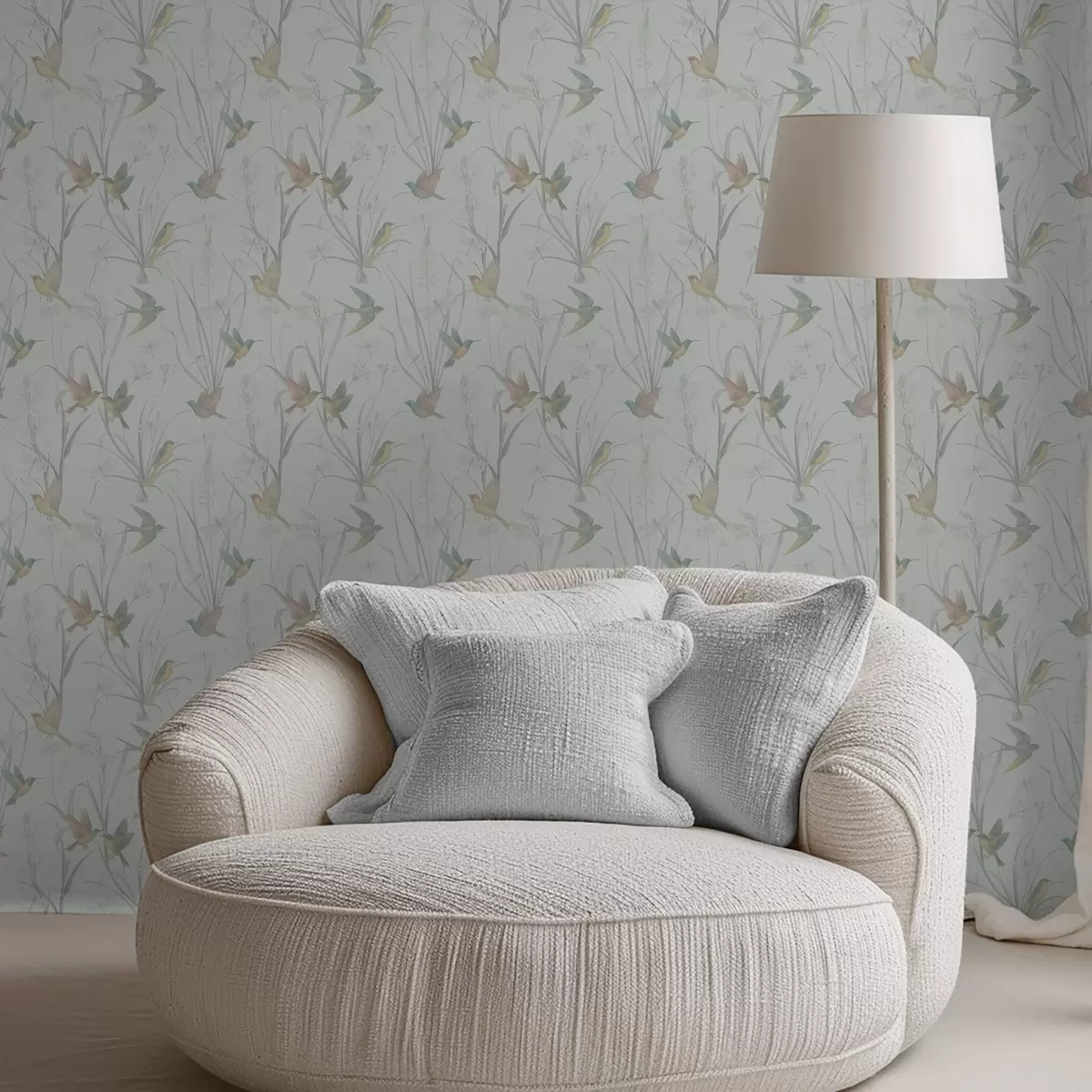 Papel de parede Pássaros entre as ervas do prado em solo cinza claro a00776v1
