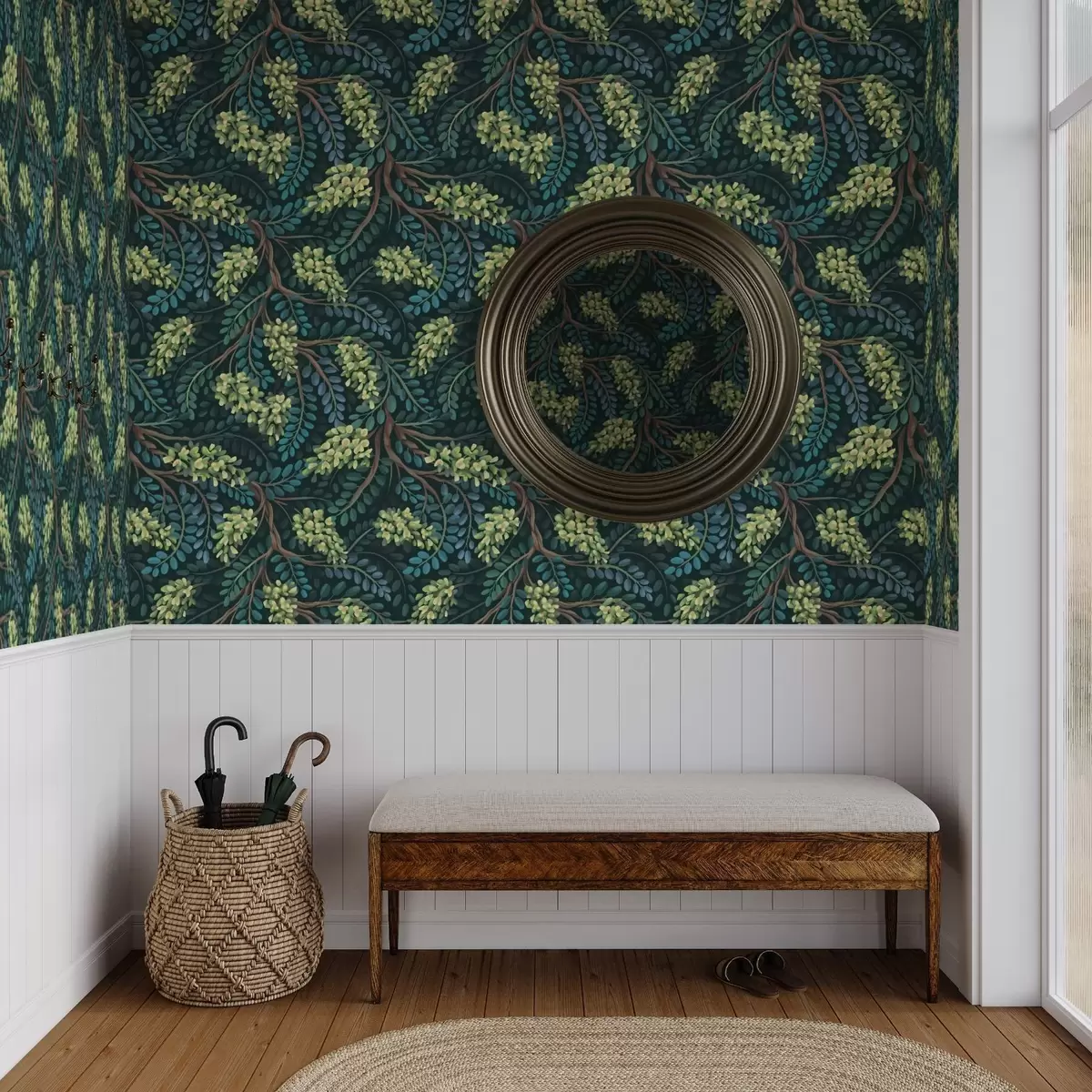 Papel de parede Galhos com inflorescências esverdeadas sobre fundo escuro a00786