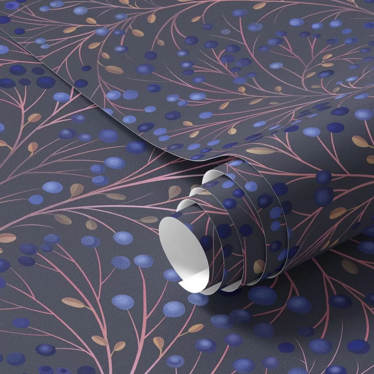 Papel de parede Galhos rosa-acastanhados e bagas azuis sobre fundo grafite Nr. a00787