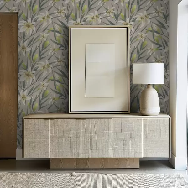 Papel de parede Lírios creme com folhas sobre fundo cinza-bege Nr. a00837