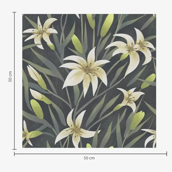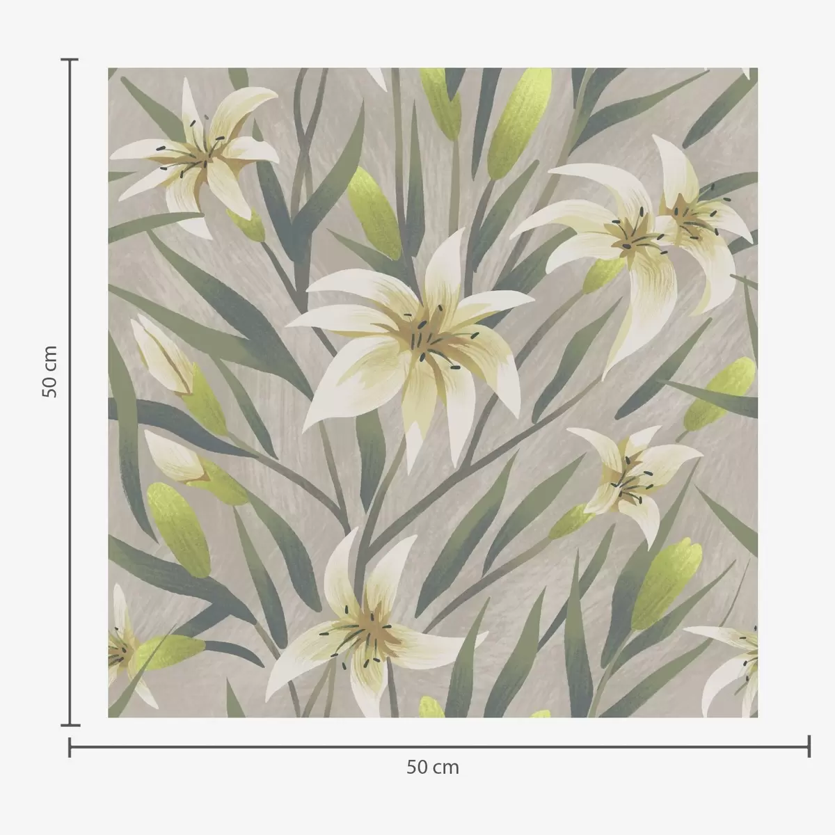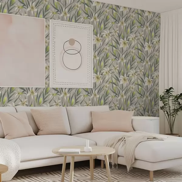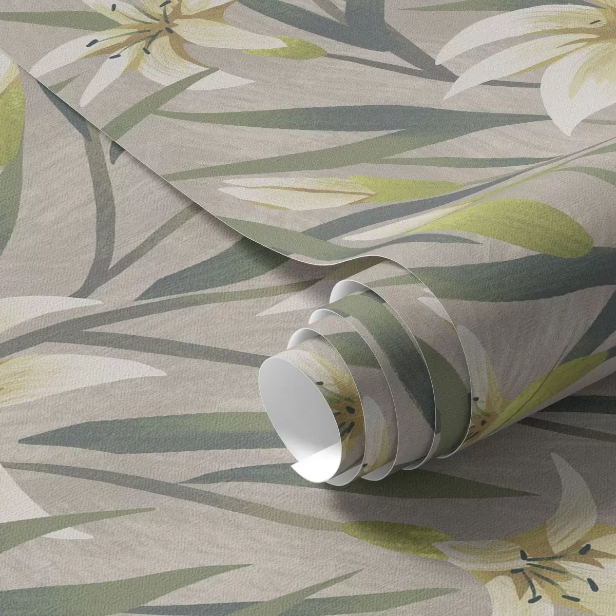 Papel de parede Lírios creme com folhas sobre fundo cinza-bege Nr. a00837
