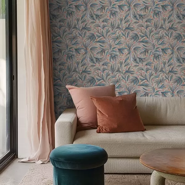 Papel de parede Folhagem azul abstrata com flores corais Nr. a00852