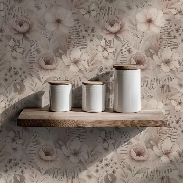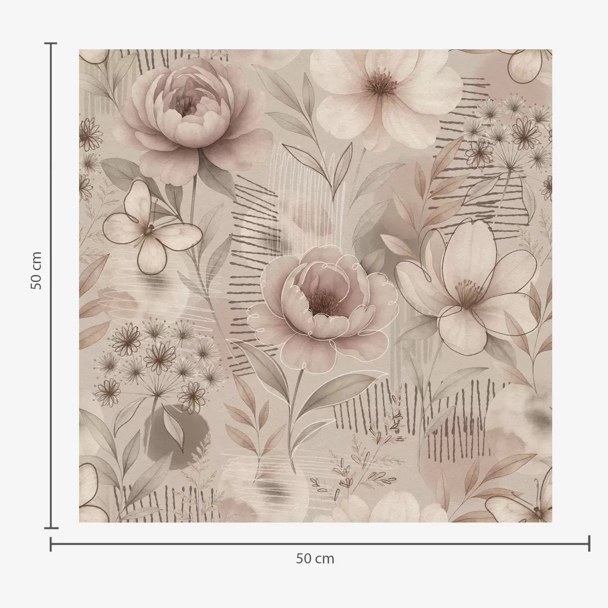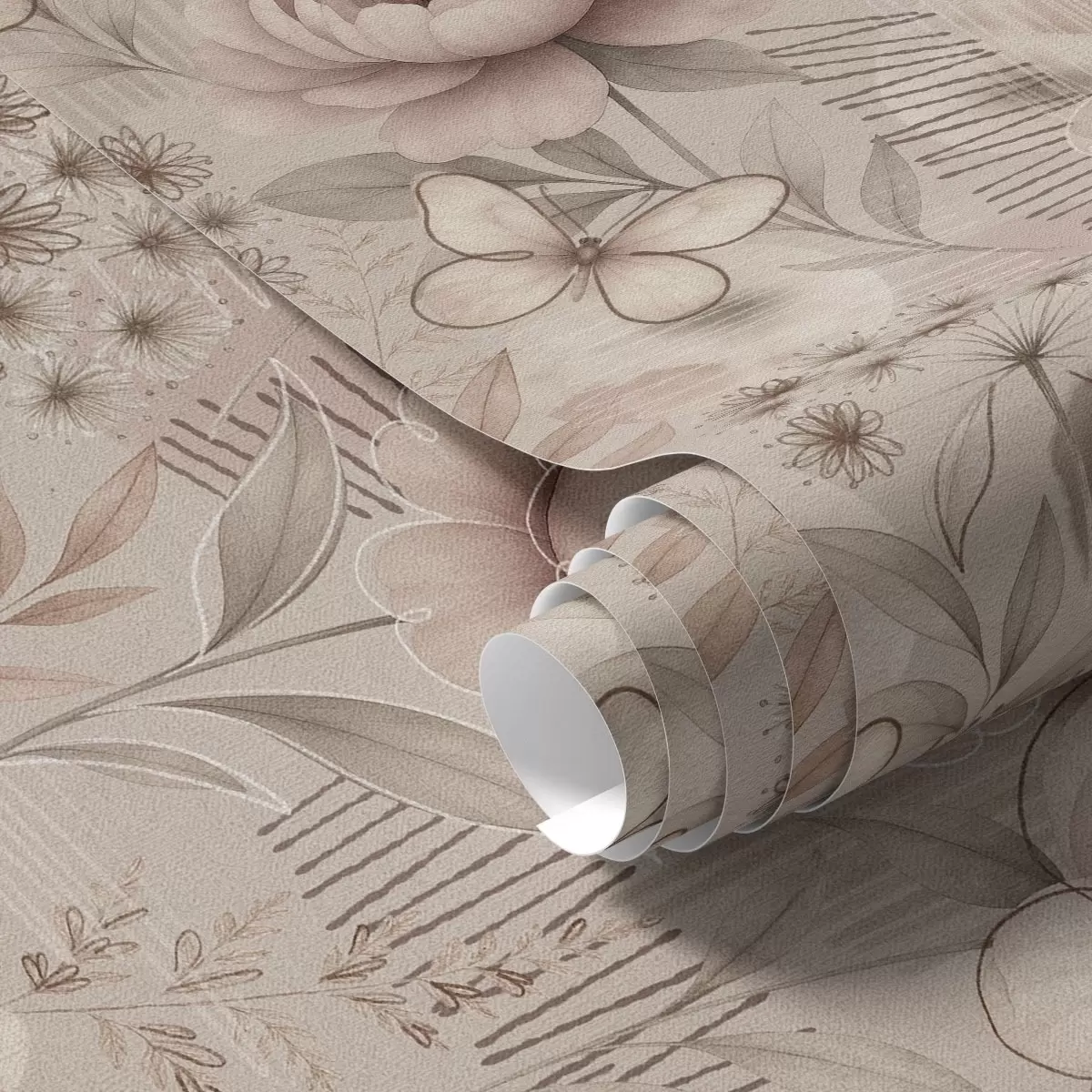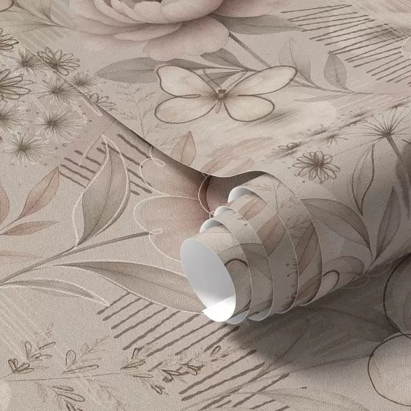 Papel de parede Florais bege sépia com detalhes lineares e borboletas Nr. a00870