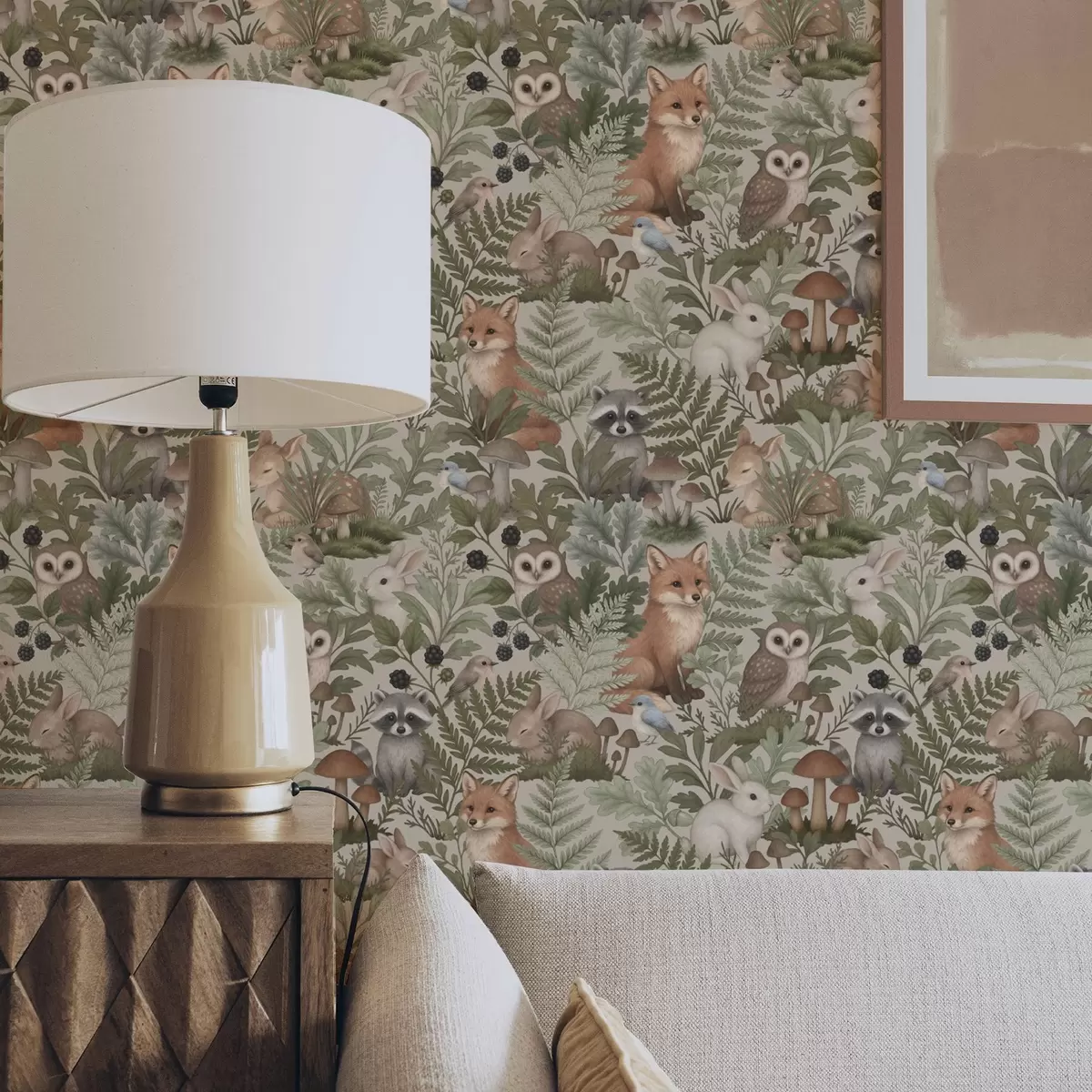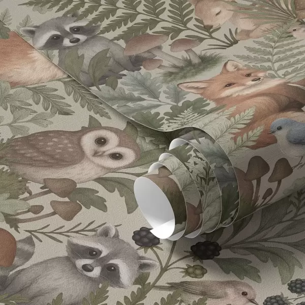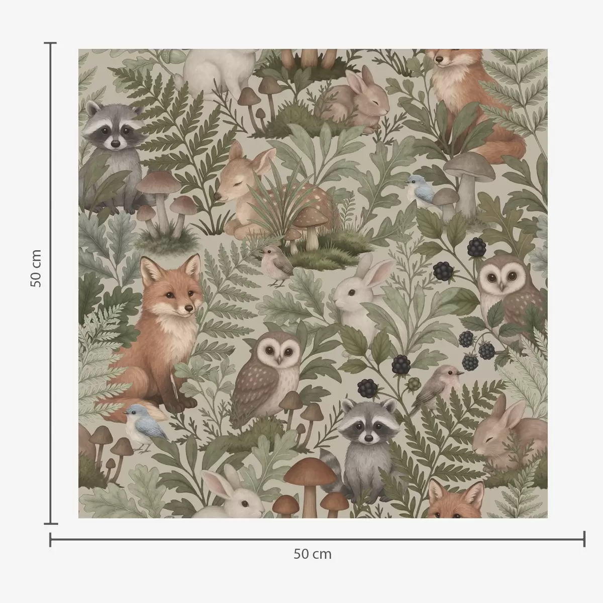 Papel de parede Animais da floresta, samambaias e cogumelos em bege claro Nr. a00880v1
