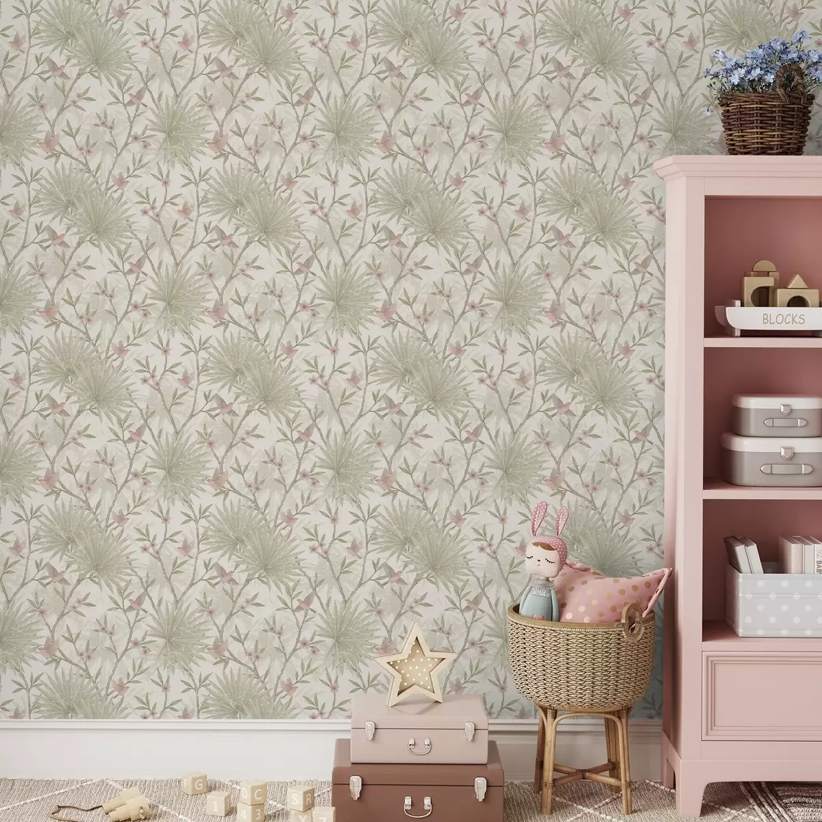 Papel de parede Delicados pássaros cor-de-rosa entre folhas de palmeira Nr. a00883