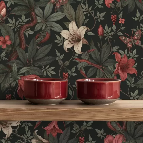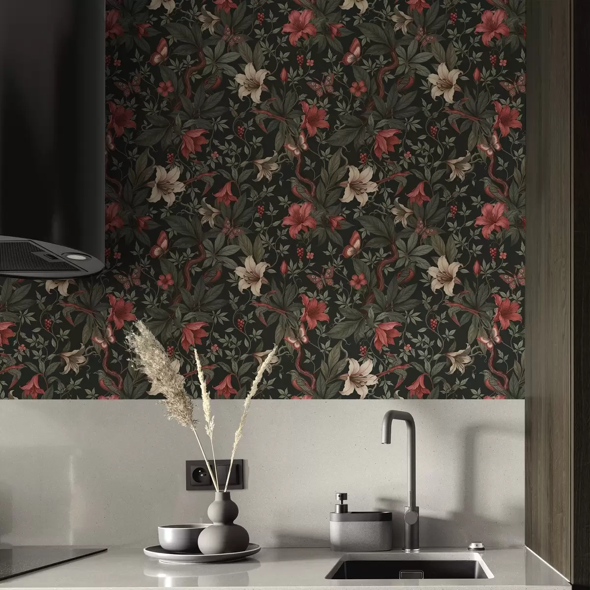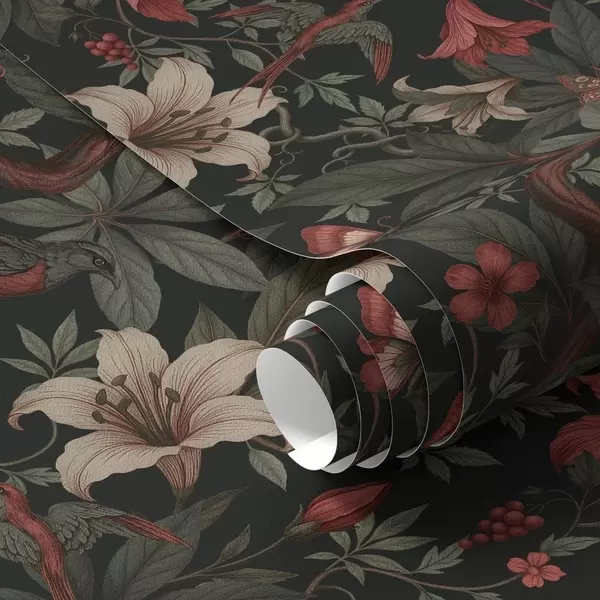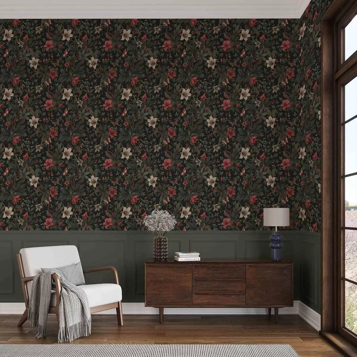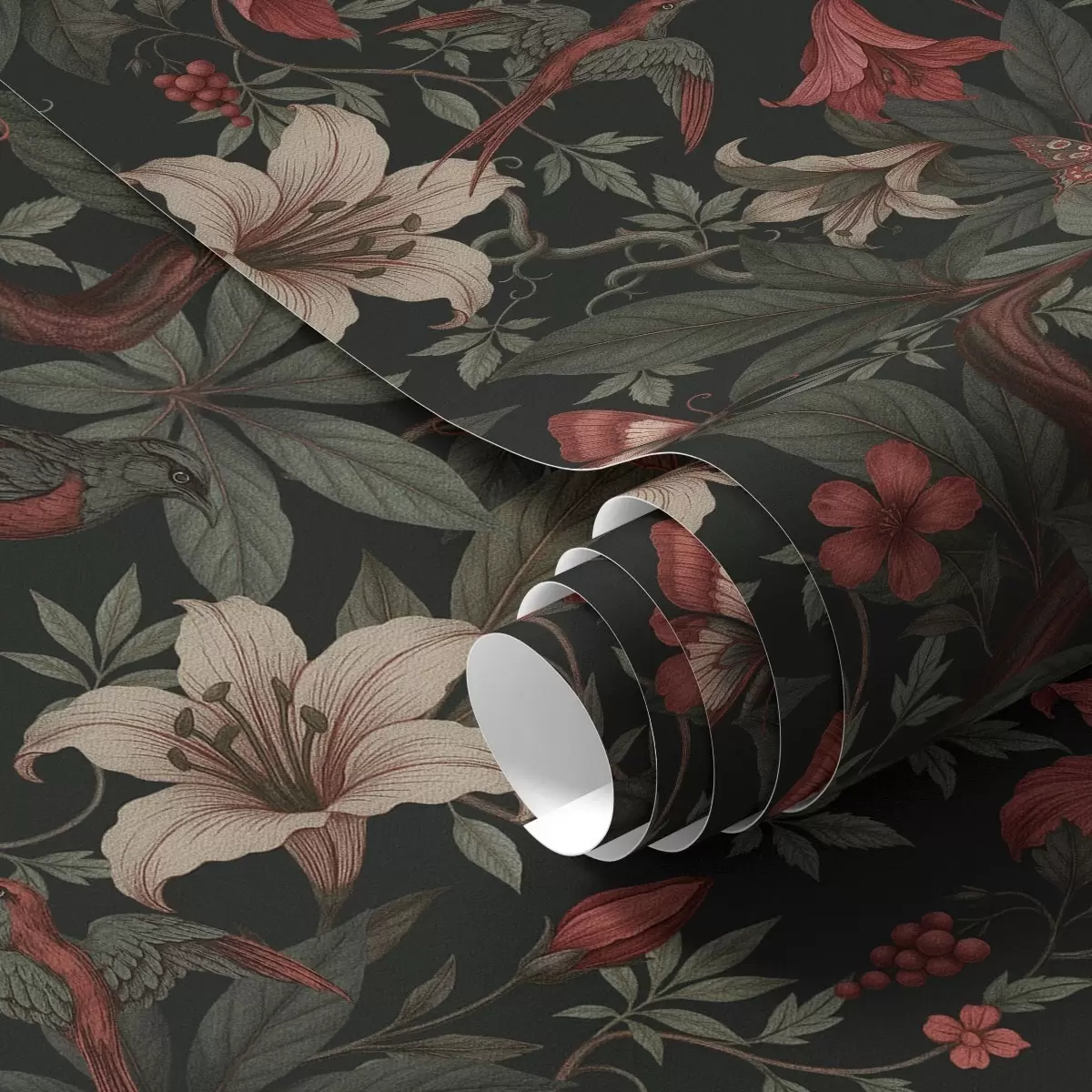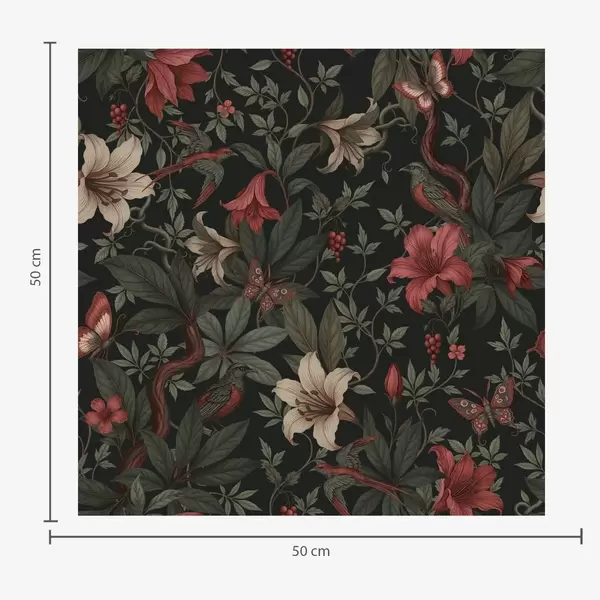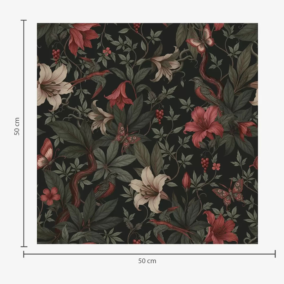 Papel de parede Flores escuras da selva com pássaros e borboletas Nr. a00895