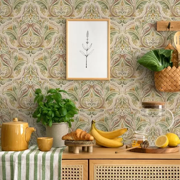 Papel de parede Espirais folhosas em tons de verde e ocre quente pintadas em aquarela Nr. a00927