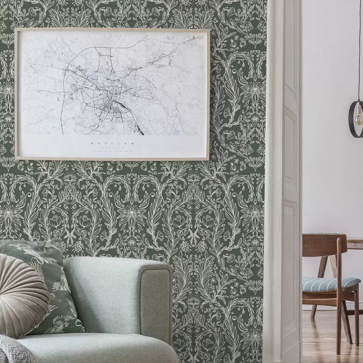 Papel de parede Padrão floral linear sobre fundo verde escuro Nr. a00929