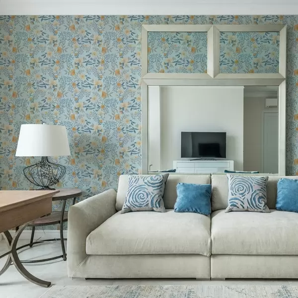 Papel de parede Flores amarelas e azuis com folhas sobre um fundo azul-celeste Nr. a00934
