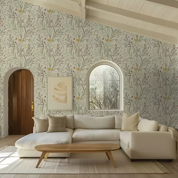 Papel de parede Flores amarelas e vermelhas sobre um fundo verde claro a00937