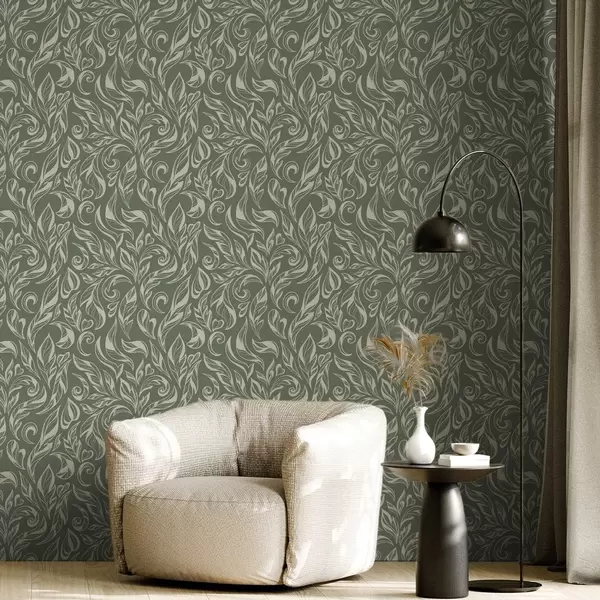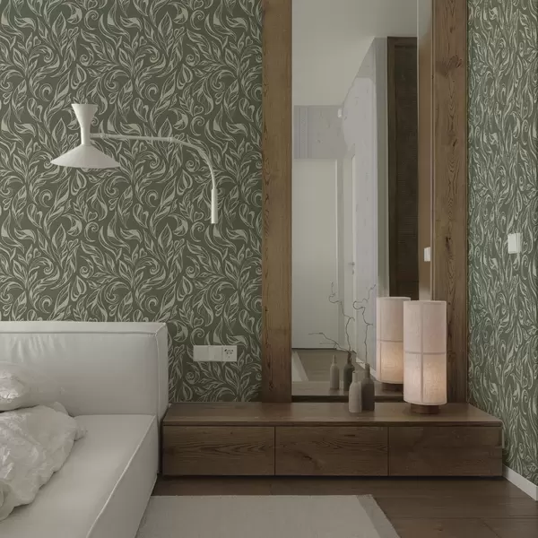 Papel de parede Ornamento folhoso creme sobre fundo cinza-esverdeado Nr. a00940v2