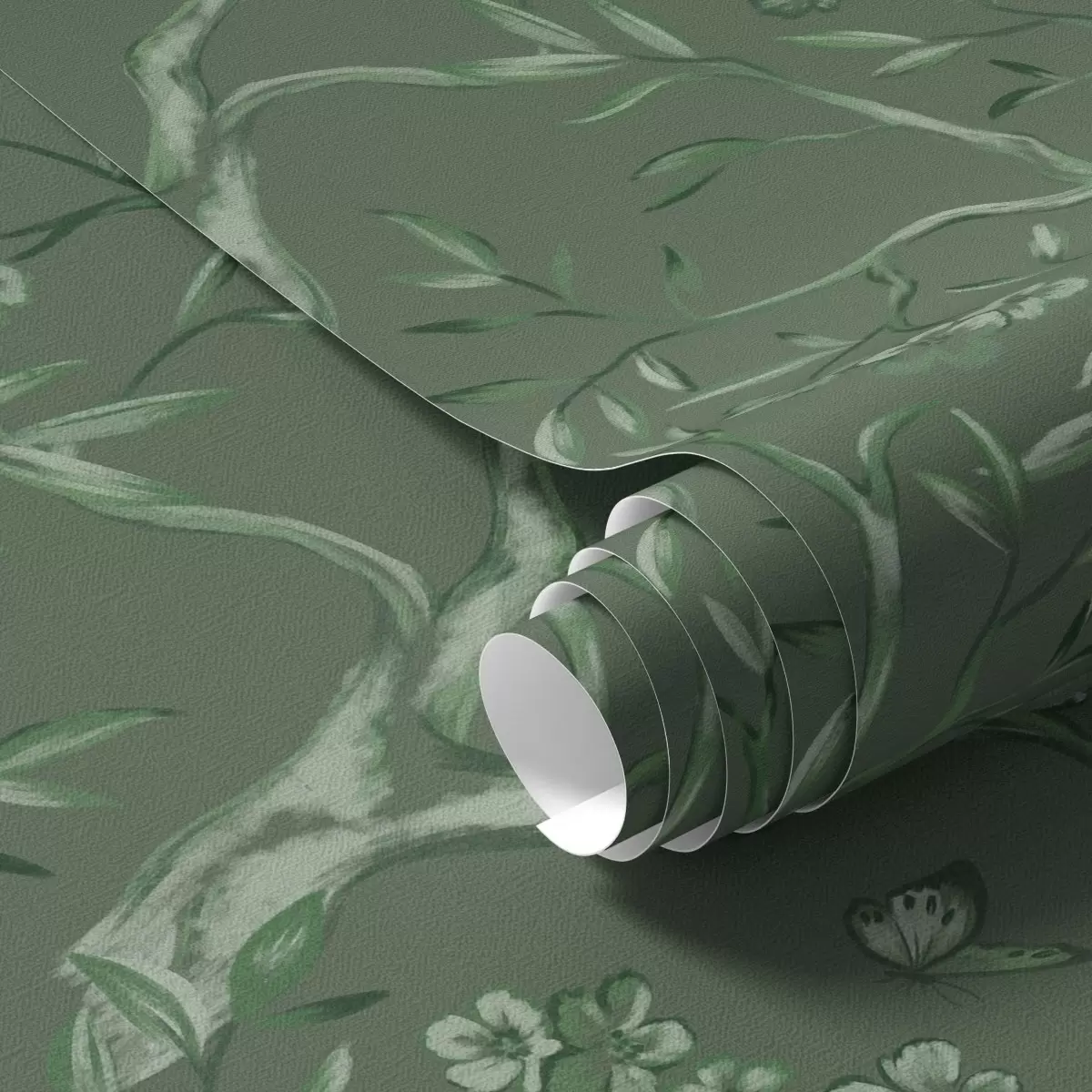 Papel de parede Galhos verdes floridos com borboletas em um fundo escuro Nr. a00951v3