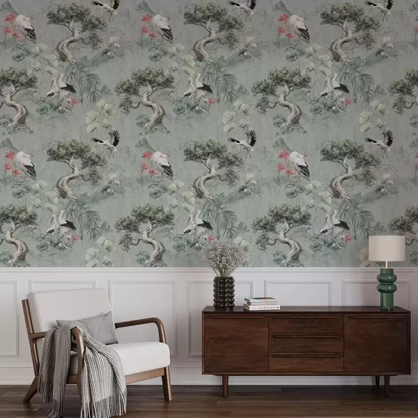 Papel de parede Guindastes entre pinheiros e lótus em um fundo verde tranquilo Nr. a00962