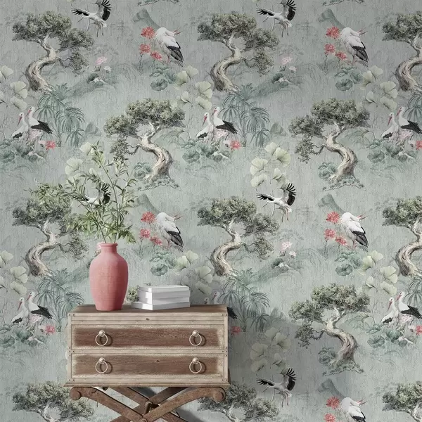 Papel de parede Guindastes entre pinheiros e lótus em um fundo verde tranquilo a00962
