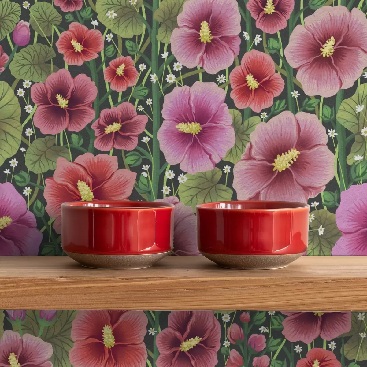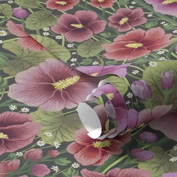 Papel de parede Flores de hibisco brilhantes e vegetação em um fundo escuro Nr. a00993v2