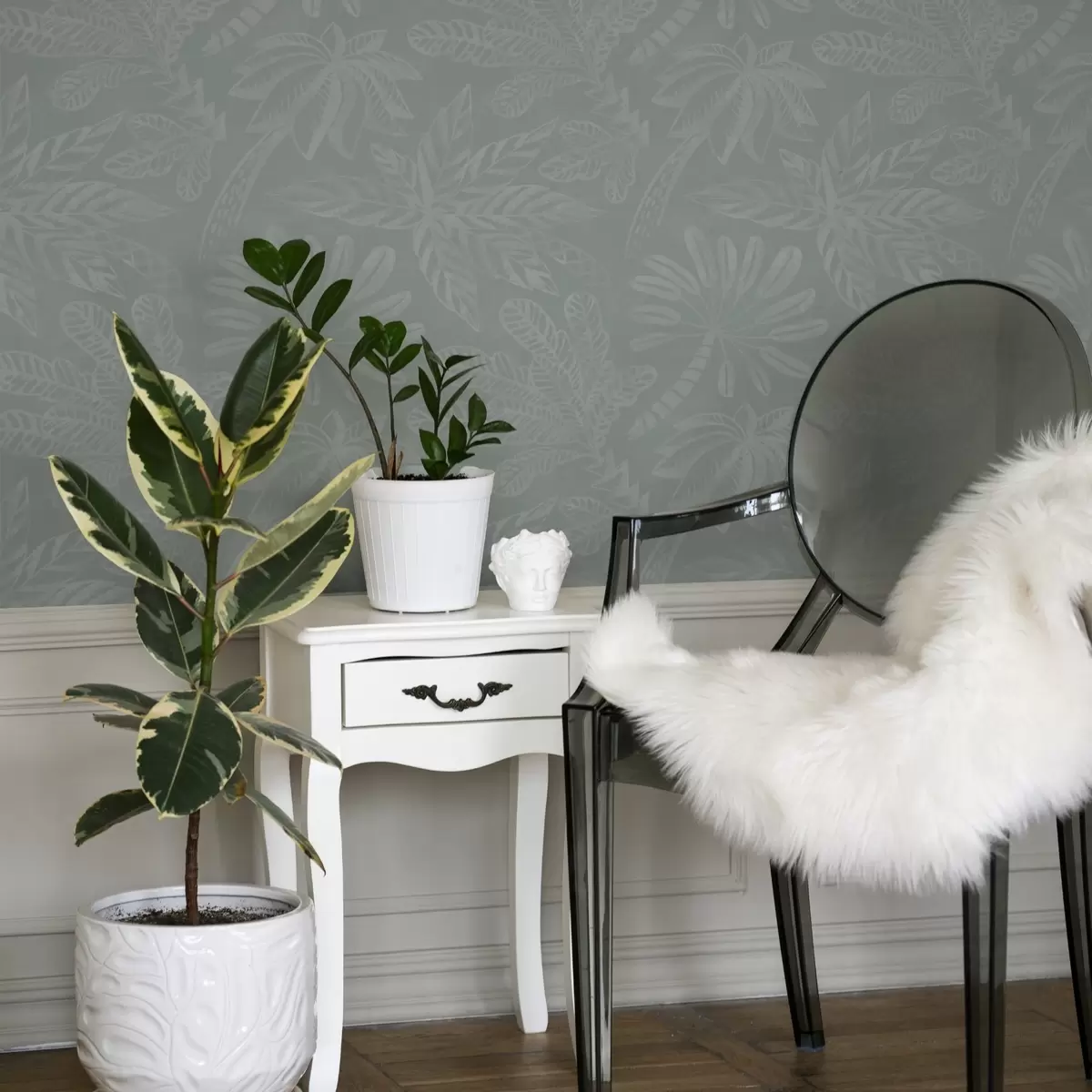 Papel de parede Folhas tropicais grandes e foscas em uma paleta cinza-menta Nr. a01001