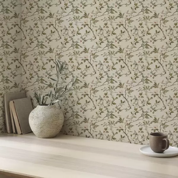 Papel de parede Galhos leves com pequenas flores creme e folhas verdes Nr. a01028