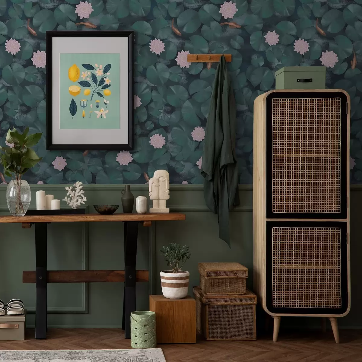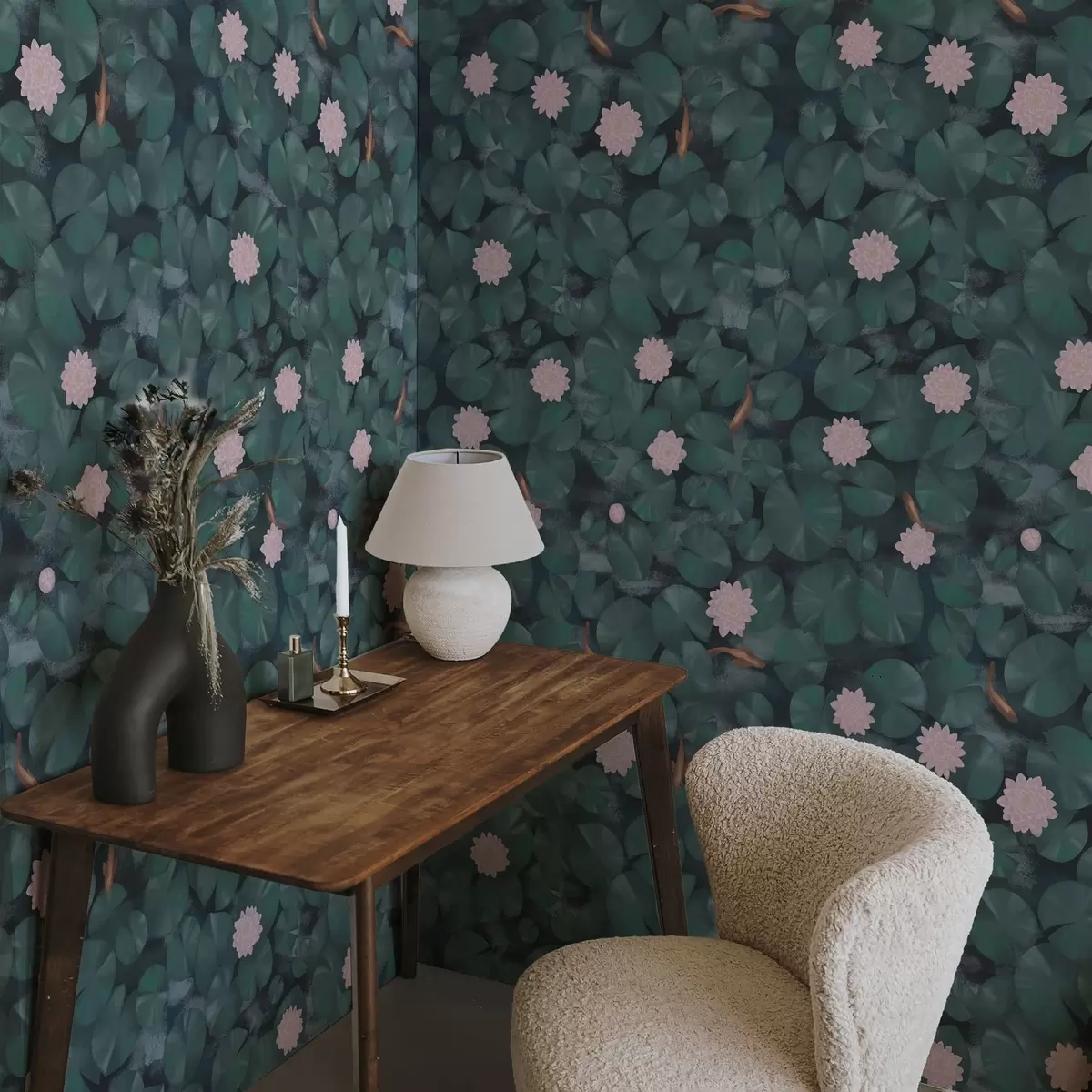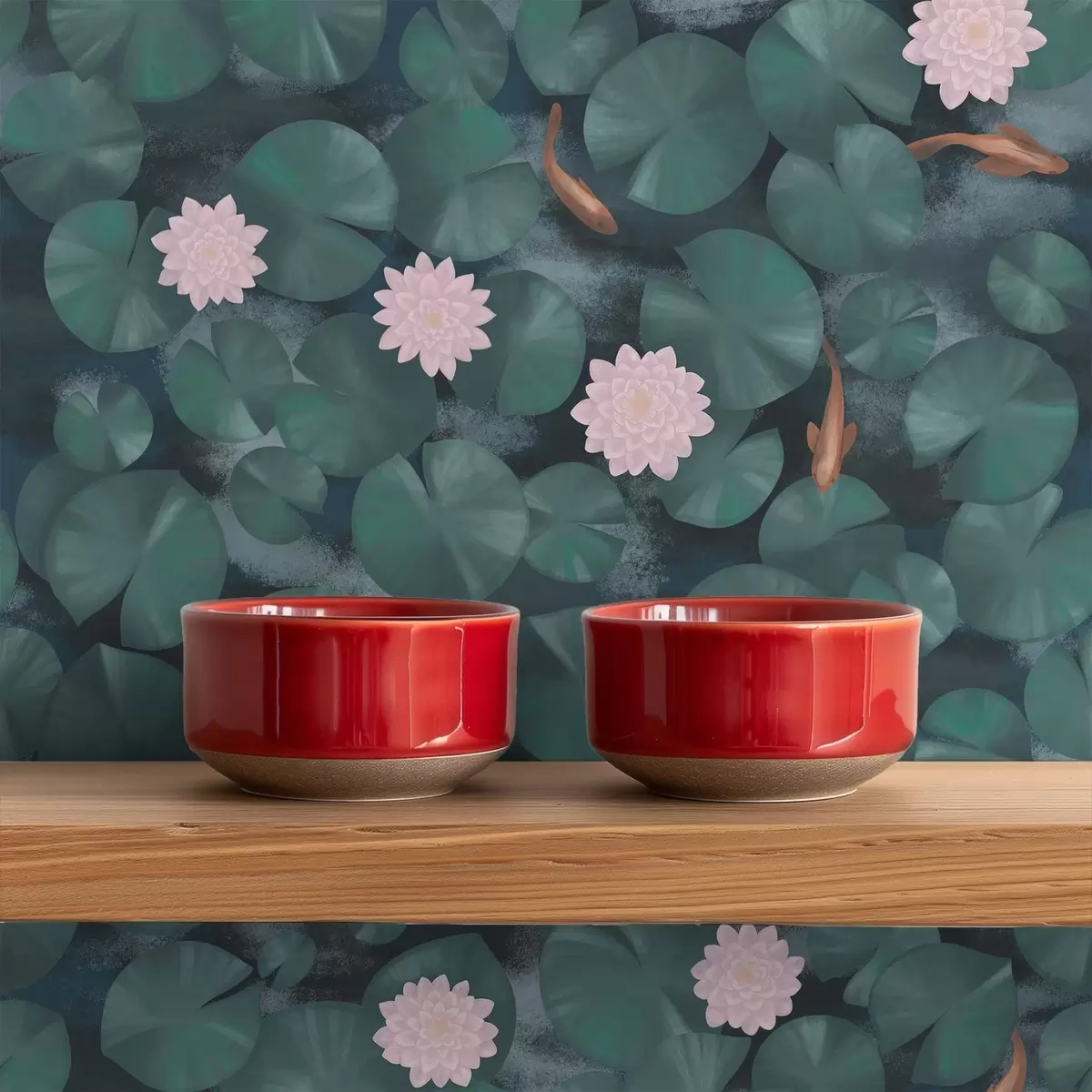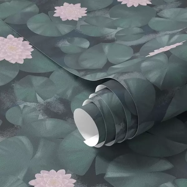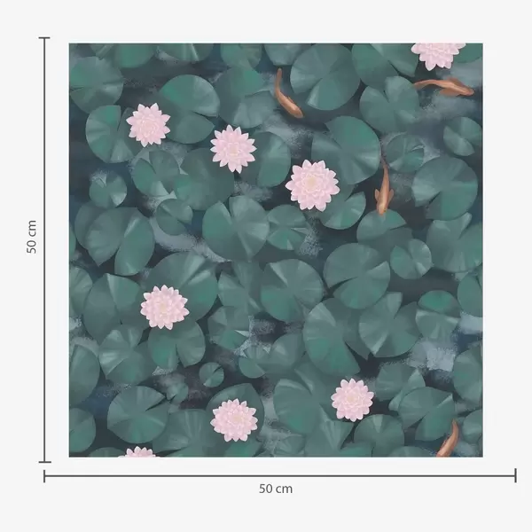 Papel de parede Nenúfares com flores e peixes sobre fundo escuro Nr. a01177